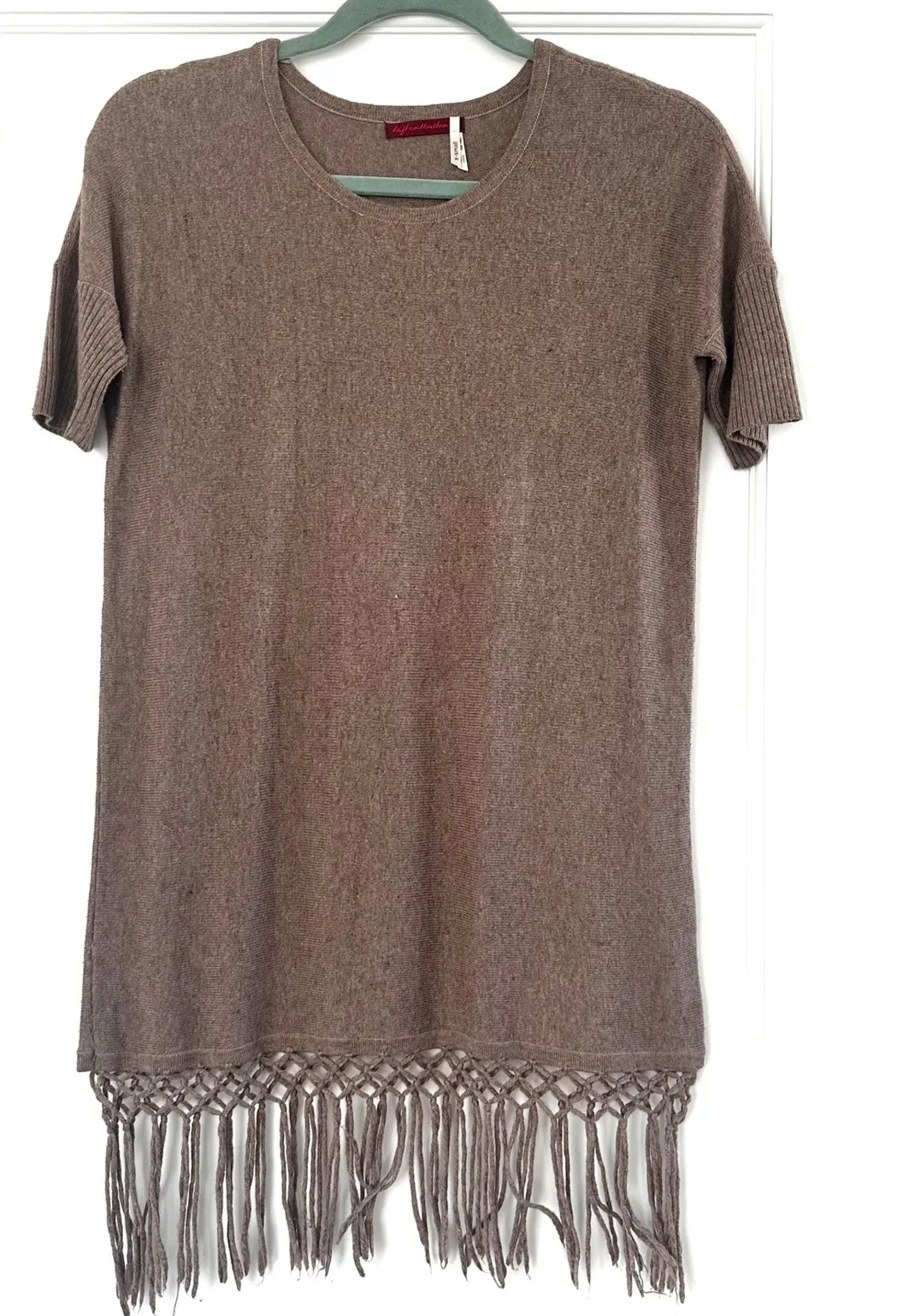 Angora blend. Hand wash. Some very light pilling. Style: Sweater Dress, T-Shirt Dress, Tunic Top Dress Length: Short Color: Brown Department: Women Pattern: Solid Sleeve Length: Short Sleeve Occasion: Casual, Party/Cocktail, Travel Material: Cashmere Fabric Type: Knit Neckline: Crew Neck Character: Bohemian, Casual, Festival, Relaxed, Comfortable Keywords: sweater dress, fringe dress, boho dress, casual dress, tunic top, short sleeve dress, brown dress, beige dress, knit dress, bohemian style, festival dress, weekend wear, left on houston, xs dress, extra small dress