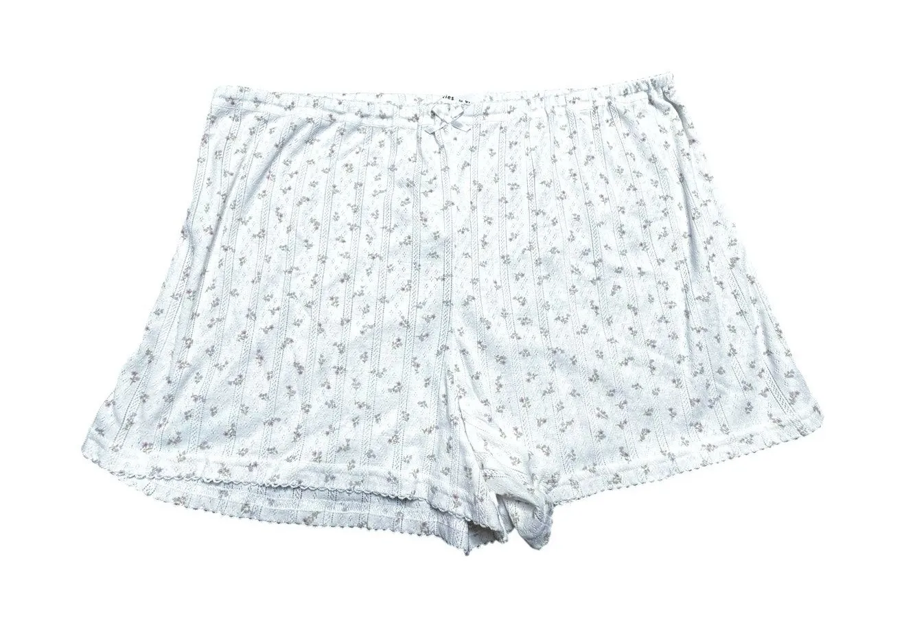 Lefties women’s US Large (EUR XL) white floral mini shorts with delicate lace trim and a tiny front bow detail. Soft, lightweight fabric with a subtle rib texture and tiny pastel floral print. Perfect for sleepwear, lounging, or pairing with a cozy tee for a soft cottagecore vibe. Elastic waistband for a comfortable fit. Short, feminine cut with scalloped lace edges.