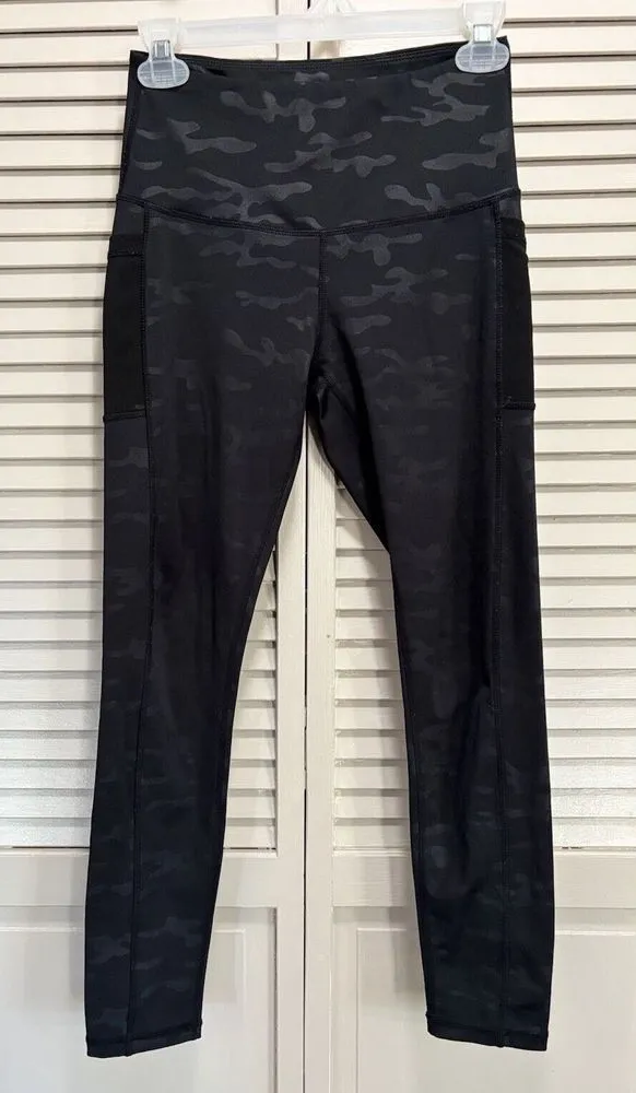 These Leg End ankle leggings in black camouflage are perfect for any athletic occasion. The blended fabric of polyester and spandex provides a comfortable and breathable wear, with compression features for the buttocks, thigh, waist, and leg. The leggings also include pockets for added convenience, and are machine washable for easy care. With a skinny leg style and a 25-inch inseam, these leggings are designed for a athletic fit, making them suitable for gym and training, track and field, walking, cycling, golf, dance, crossfit, yoga, pilates, hiking, running, and jogging. The leggings are available in size small, with a waist size of 24 inches and a rise of 9 inches. (1522)