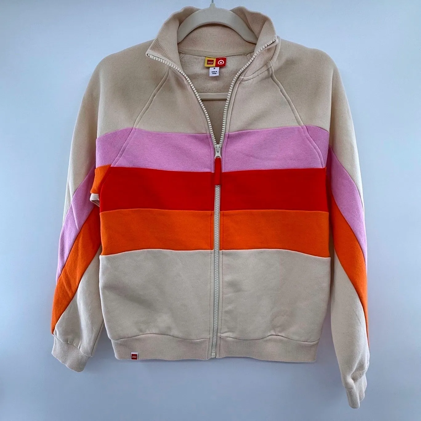 LEGO x Target collaboration full zip fleece hoodie jacket featuring a neutral beige base with bold horizontal colorblock stripes in lavender purple, red, and orange. Soft fleece interior with ribbed cuffs and hem, mock neck collar, and smooth front zip closure. Finished with a subtle woven LEGO logo tag at the hem. This piece works as a zip hoodie, lightweight fleece jacket, or casual sweatshirt layer. Ideal for everyday wear, travel, lounging, errands, or casual streetwear styling. Strong appeal for LEGO fans, Target collaboration collectors, and athleisure wardrobes. • Mock neck collar • Ribbed cuffs and hem • Colorblock stripe design • Soft fleece interior • LEGO logo detail Ships fast from Minnesota. Target collaboration, striped sweatshirt, retro style, color block, athletic wear, casual jacket, sporty, outerwear, loungewear, pullover, vintage inspired