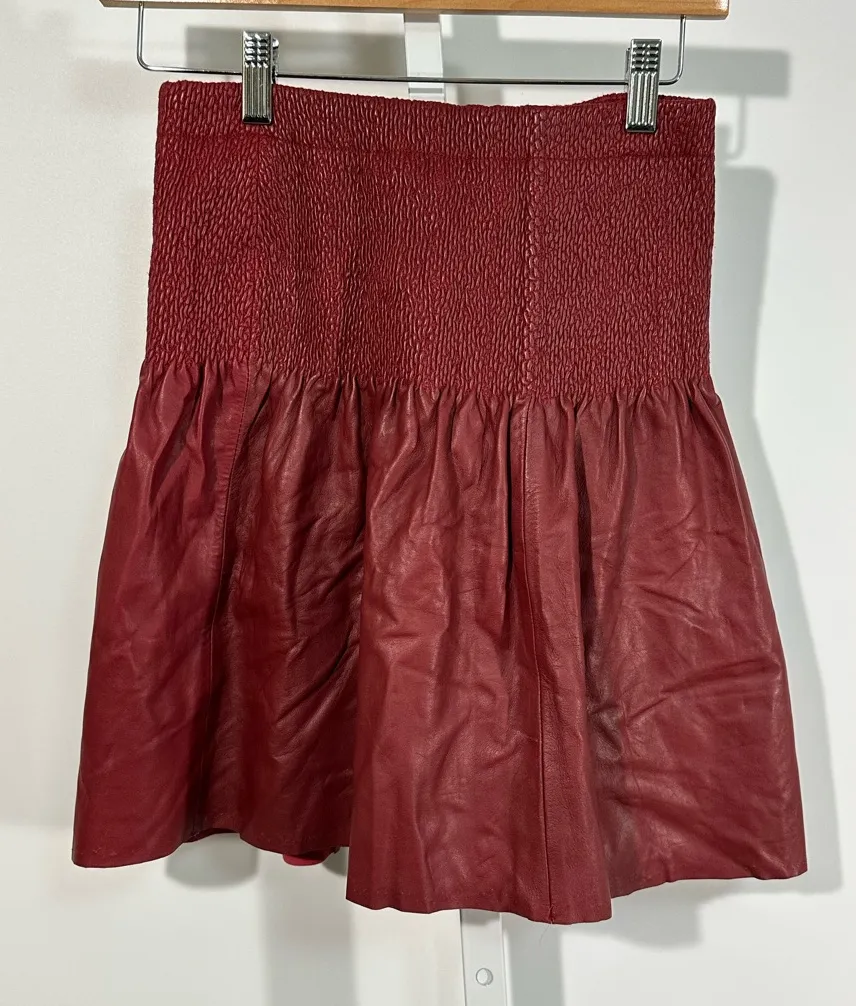 Gorgeous and rare Leifsdottir for Anthropologie genuine leather skirt in a deep wine red hue. Features a beautifully smocked elastic waistband that flatters the waist and flows into a soft, buttery 100% leather skirt with subtle volume and movement. Fully lined in 100% cotton for comfort. This piece has that effortlessly chic, bohemian-luxe Anthropologie feel — perfect with a chunky sweater and boots for fall or dressed up with heels and a silk cami for night. Details: • Brand: Leifsdottir (Anthropologie) • Size: 4 • Waist: 25” before stretch • Length: 18.5” • Material: 100% Leather exterior, 100% Cotton lining • Made in India • Smocked waistband, pull-on style • Color: Deep red / burgundy Era: Late 2000s – early 2010s Anthropologie (Leifsdottir line was discontinued circa 2011) ✨ Beautiful condition — leather is soft and supple, no flaws.