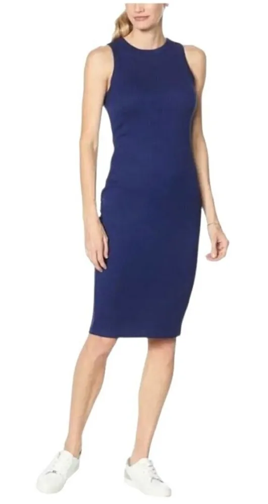 The Leith dress is a chic, sleeveless midi tank dress in XS for women. Its blue hue, crew neck, and racerback design make it a versatile wardrobe staple.