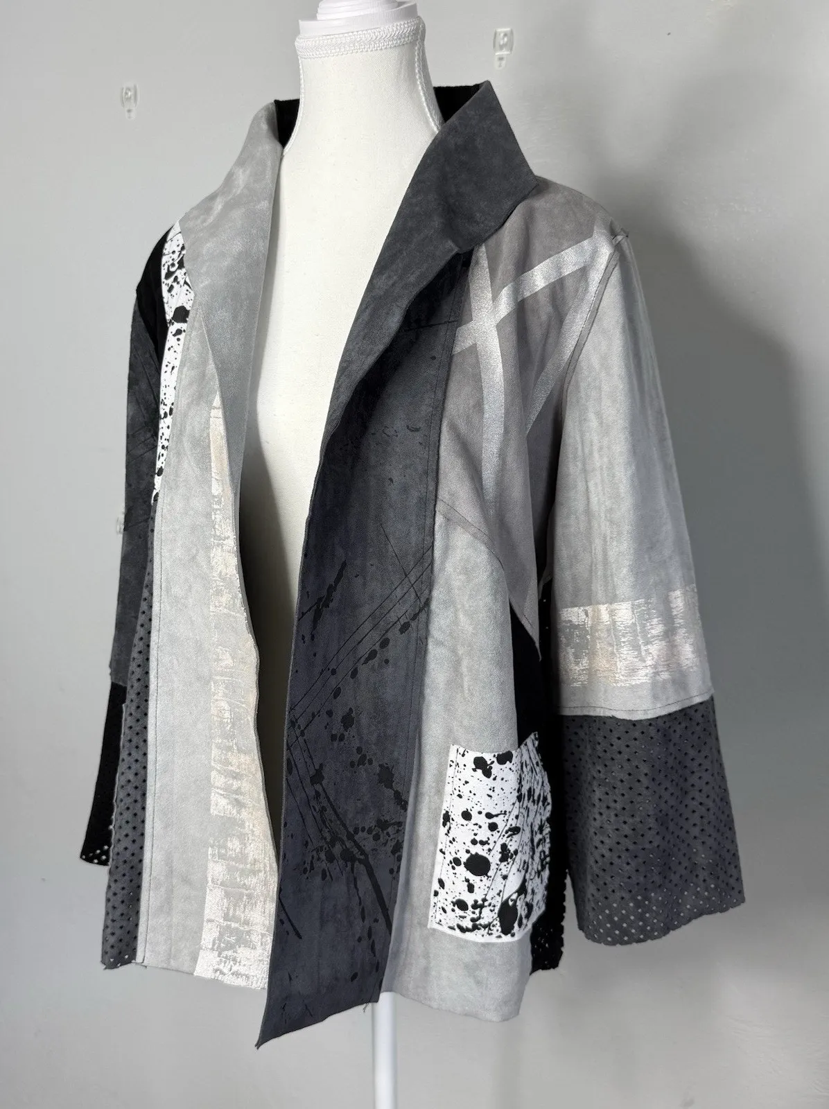 This Lemon Grass jacket combines modern style with artsy flair. Featuring a patchwork design in black, gray, and white, it has an open front, long sleeves, and a relaxed fit. Made with stretch fabric for comfort, it’s perfect for layering and elevating any outfit. Details: • Brand: Lemon Grass • Size: XS • Color: Black, Gray, White (patchwork) • Style: Open front jacket • Sleeve Length: Long sleeve • Material: 90% Polyester, 10% Spandex • Care: Machine wash cold, gentle cycle; line dry • Made in China Approx Measurements (laid flat): • Armpit to Armpit: 20” • Sleeve Length: 19.5” • Length: 25” Condition: Good pre-owned condition. Shows only light creasing where folded in the front (see photos). Most items I sell are thrifted or secondhand and may have a light laundry detergent scent. All items come from a smoke-free, pet-friendly home. Feel free to make offers or ask questions!