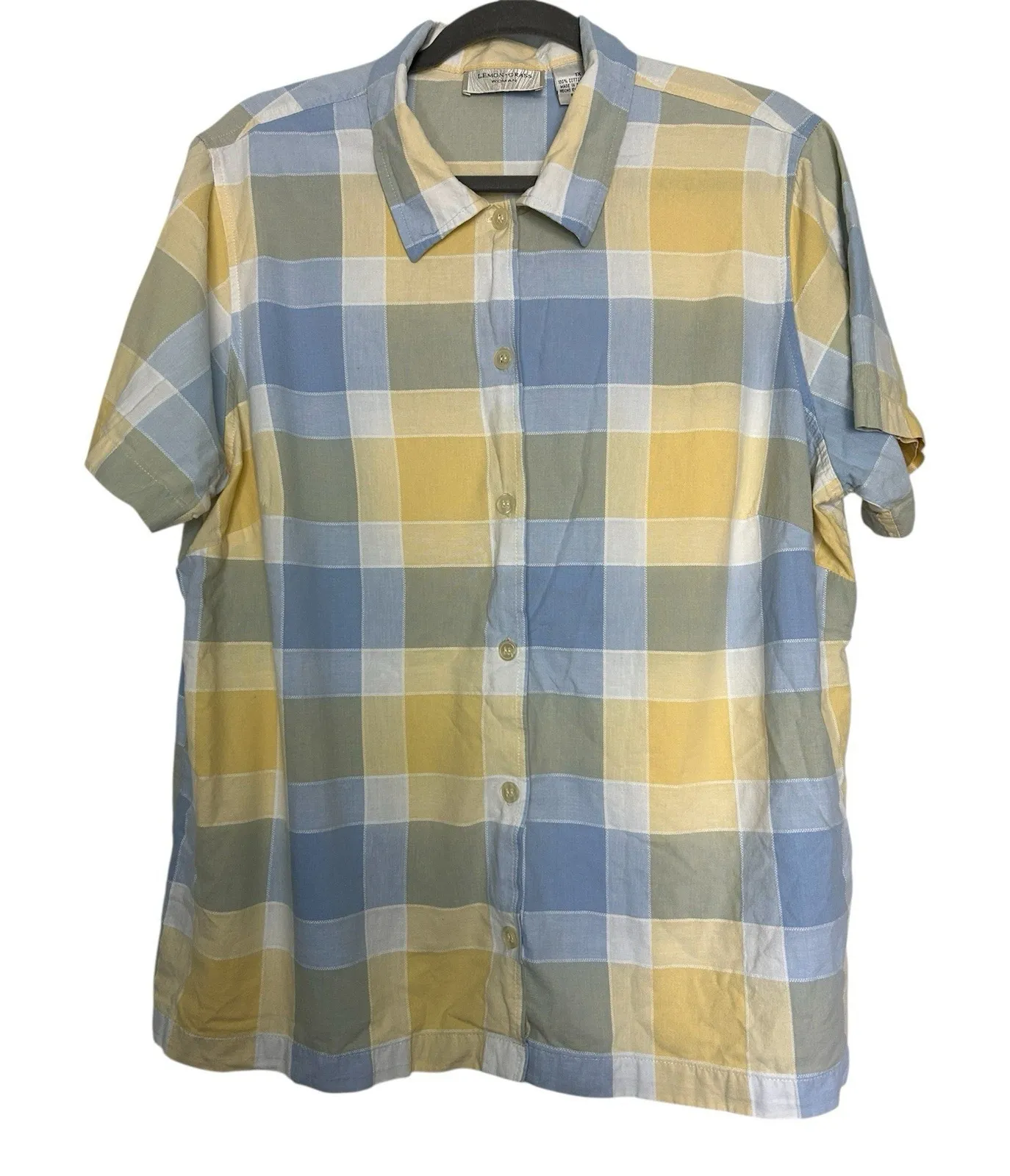 The product is a VTG Lemon Grass women's size 1X yellow and blue plaid short sleeve button-up shirt... Show more