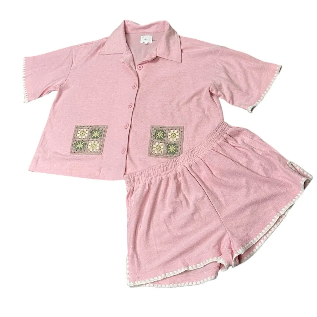 Polyester/viscose Short sleeve top with elastic waist bottoms Crochet pockets and crochet hemline Lightweight Terry style New without tags Small light stain top left next to collar - see photo - may come out with a wash. BIN400