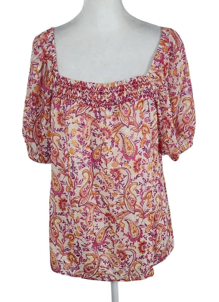 Les Serein pink, purple, and orange top. Make me an offer! Style: flowy blouse with smocking Color: multi-color paisley Special features: lined, smocked, swiss dot Condition: new with tags, but does not have a care/fabric tag Measurements are taken while laying flat and shown in images. 1124-29-c3a