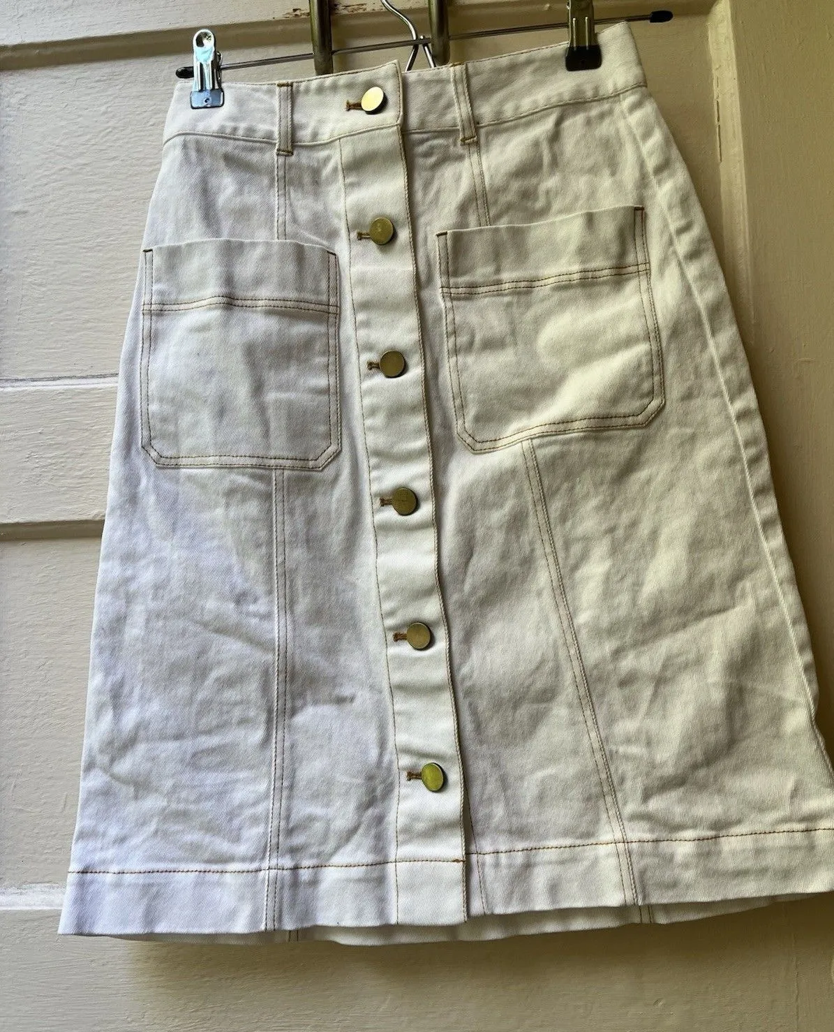 Lesley Evers Alison Pencil Skirt Xs White Straight Cut Nautical Sea Beach Preppy Alison style name white with yellow contrast stitching button down the middle midi length Size XS see pics for measurements Cotton and spandex blend two open front pockets See pics for measurements coastal summer beach festival normcore feminine