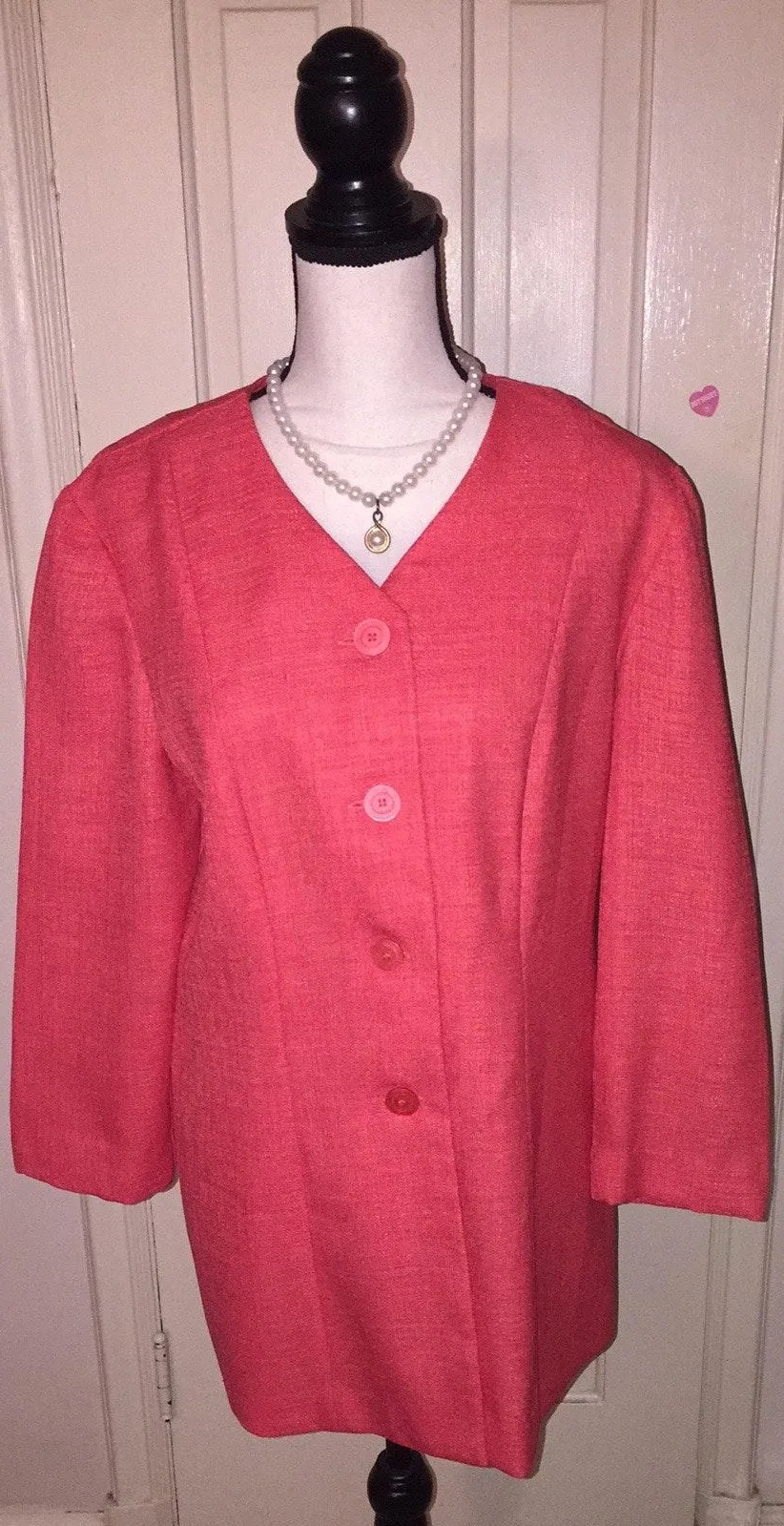 Lovely Designer 2-Piece Suit. Jacket and Skirt combination. Coral color. 3 button closure. V-Neck. Tie Back. Vibrant look. Perfect for Spring/Summer fashion. 100% Polyester. Size 16. Jacket - Armpit to Armpit measures 21”. Length measures 30”. Skirt - Waist measures 32”. Length measures 28 1/2”. (Has 2” Hem, if longer length required).