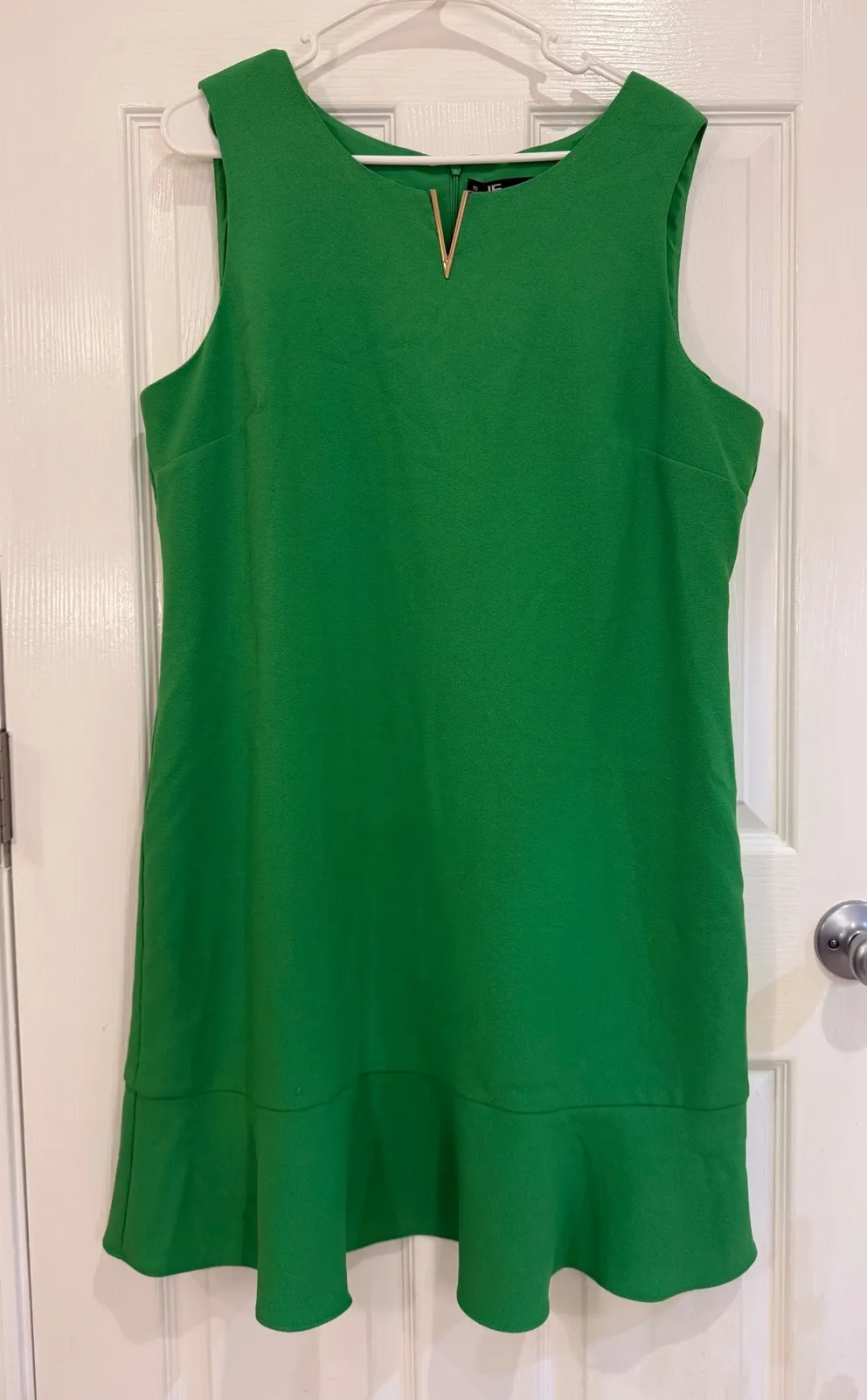 Chic sleeveless dress in a vibrant green hue, perfect for adding a pop of color to your wardrobe. This Leslie Fay dress features a flattering silhouette with a round neckline and a stylish gold V accent at the center. The dress is designed with a subtle ruffle hem, adding a touch of playful elegance. Fully lined for comfort and a smooth fit, it's a versatile piece that can be dressed up or down. Ideal for a garden party, a business casual event, or a weekend brunch. Style: A-Line, Shift Dress Length: Knee Length Color: Green Department: Women Sleeve Length: Sleeveless Pattern: Solid Occasion: Business, Casual, Party/Cocktail, Workwear Material: Polyester, Spandex Neckline: Round Neck Character: Retro, Chic, Party Girl, Spring, Summer Fabric Type: Woven Season: Spring, Summer Ask for measurements!