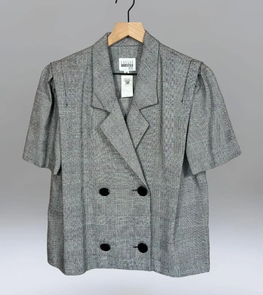 Pre-Owned | Good Condition Size: 16 Measurements: (Measurements laid flat; be sure to leave some wiggle room) Vintage runs differently - use measurements for the best fit! *Chest 21.5" *Armpit to Armpit 21.5" *Sleeve Length 10.5" *Shoulder to Shoulder 16.25" *Waist 21.5" *Length from Shoulder 24.25" Color: Black & White Check Details: Unlined, Lightweight, Soft Fabric, Boxy Fit, Double Breasted, Shoulder Pads, Colored Stitching Throughout - Looks like Small Dots *No Pockets* Materials: 50% Polyester, 50% Rayon Machine Washable *Note: Item color on pictures may vary due to room lighting or monitor settings. Most of the items in the shop are in great condition but don’t forget that these pieces are previously owned so if there are any major flaws I will always be sure to make a note of it in the description along with photos (note - minor flaws may go unnoticed). If you have any further questions about the item I am more than happy to help! Vintage, 80s, Career, Office