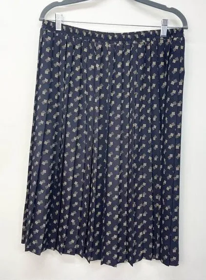 Leslie Fay Vintage Pleated Skirt Abstract Pattern Size 20 WP Cute pleated skirt with a fun abstract shape pattern featuring squares and dots. Navy blue background. Condition Very good Measurements are approx and laying flat Elastic Waist 16" Length 27" Fabric - See photo All items ship from a pet and smoke free environment Fast shipping Cute skirt , vintage plus skirt , spring , unique 50, dainty , feminine , classy Bn 279