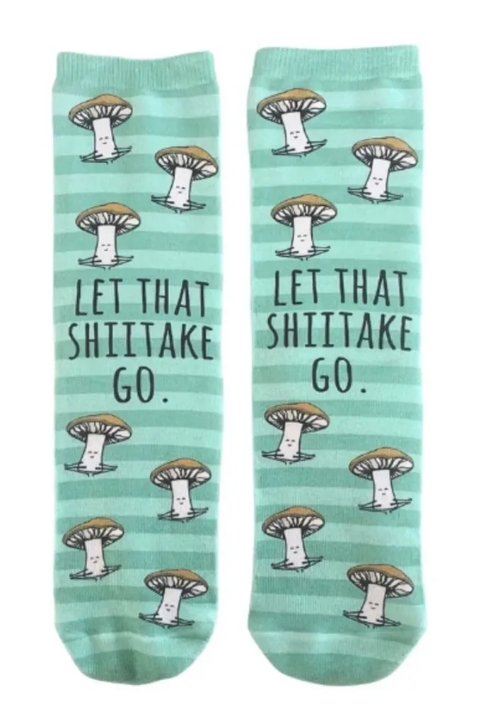 NWT Moonlight Makers "Let That Shitake Go" mushroom unisex socks in green stripes. Adorably zen mush... Show more