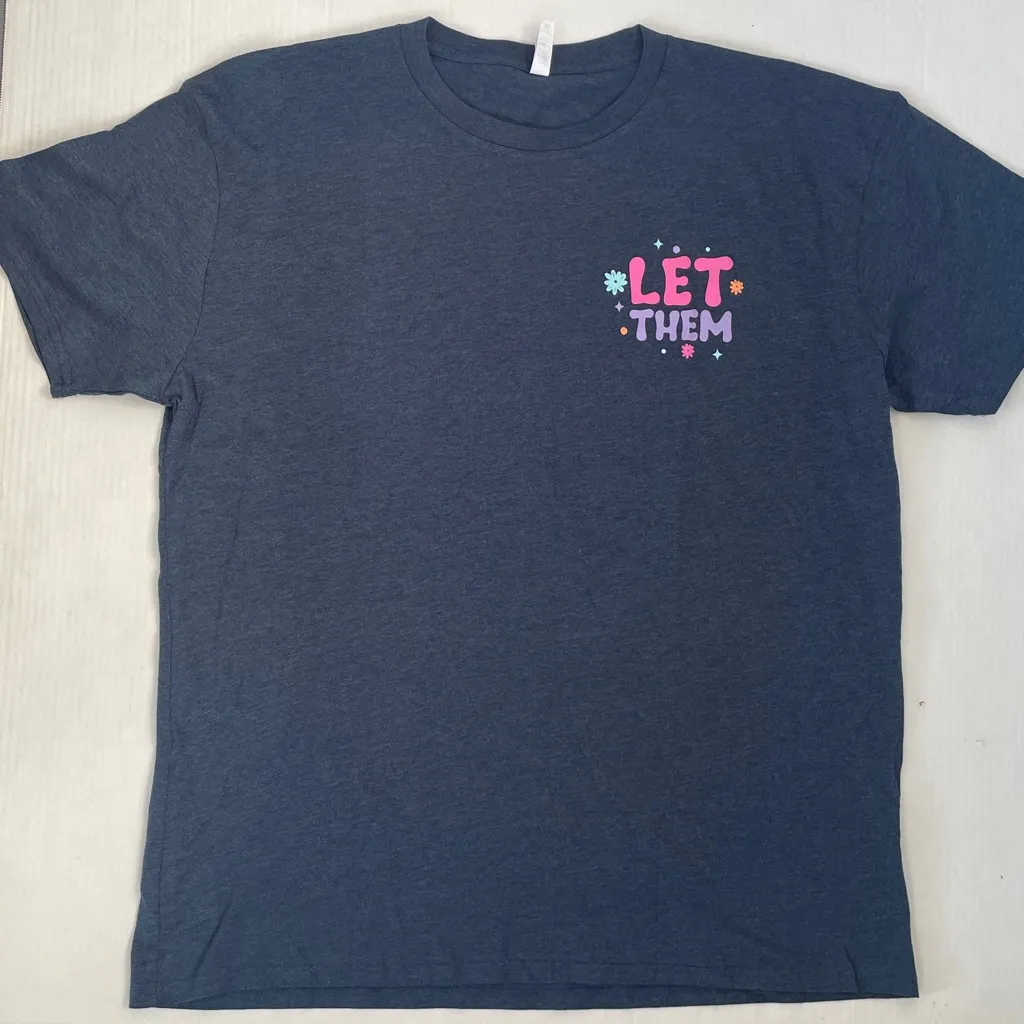 Condition: Great preowned condition Size: XL Color: Blue Stay stylish with this blue short sleeve tee featuring a vibrant colorful 'LET THEM' graphic. Perfect for everyday wear. Color may vary due to monitor or device settings.