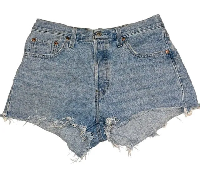 Keywords: Levi's, denim shorts, frayed hem, light wash, button fly, casual shorts, women's shorts, vintage shorts, summer shorts, festival shorts, high waisted shorts, blue denim shorts, Levi's 501 shorts, distressed shorts