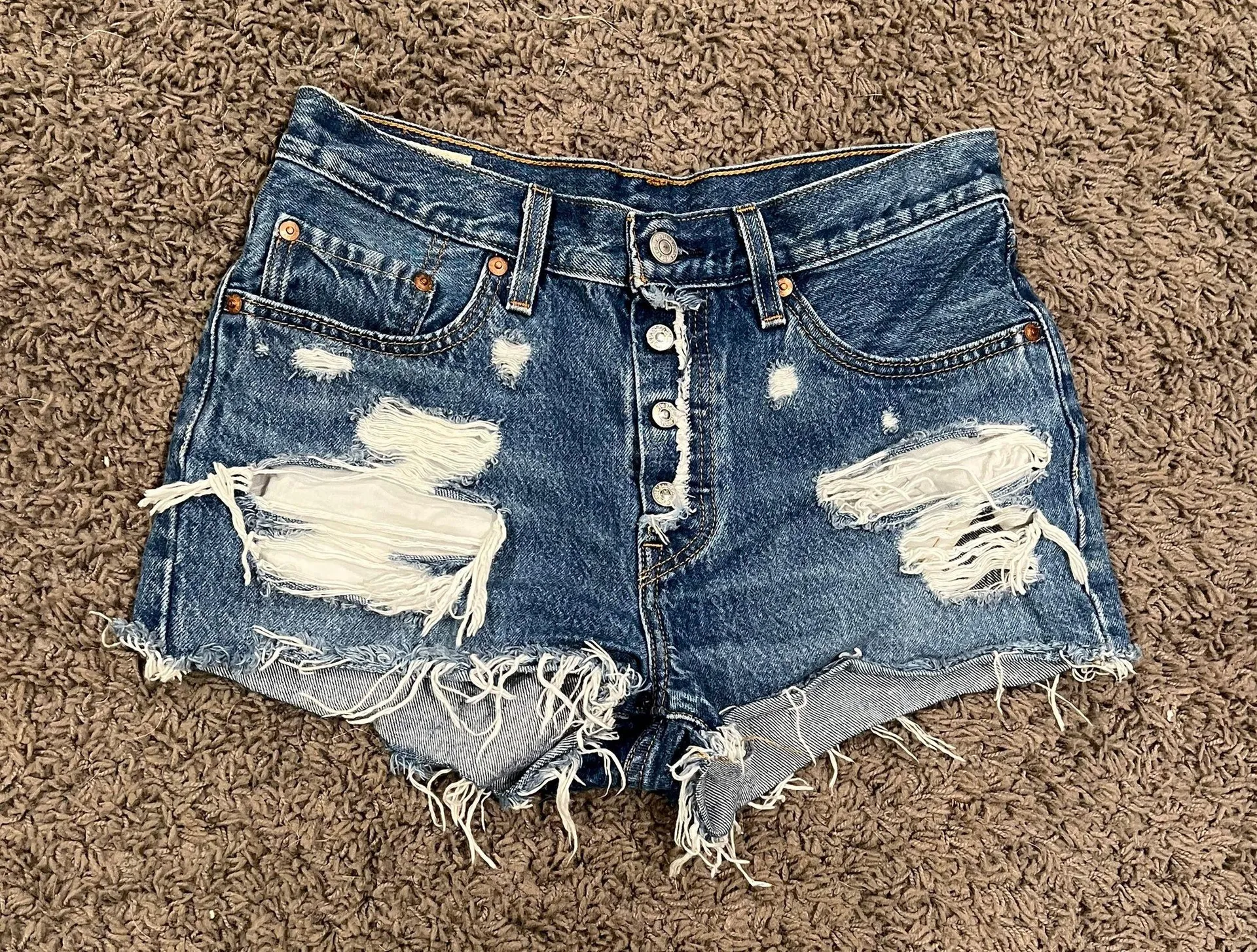 Distressed Denim Jean Shorts from Levi’s in the 501 style. Waist measures at about a 14.5”
