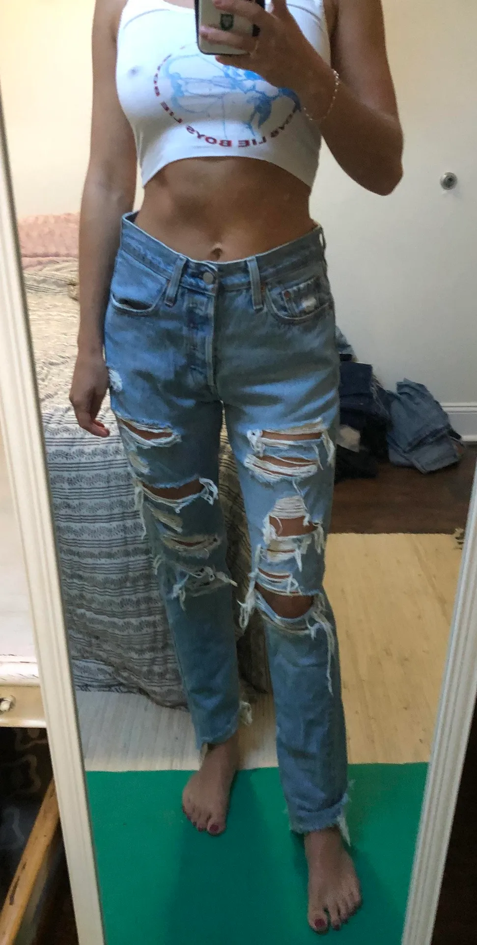 Really cute and comfy ripped jeans. Very good condition. Worn a handful of times. No flaws!