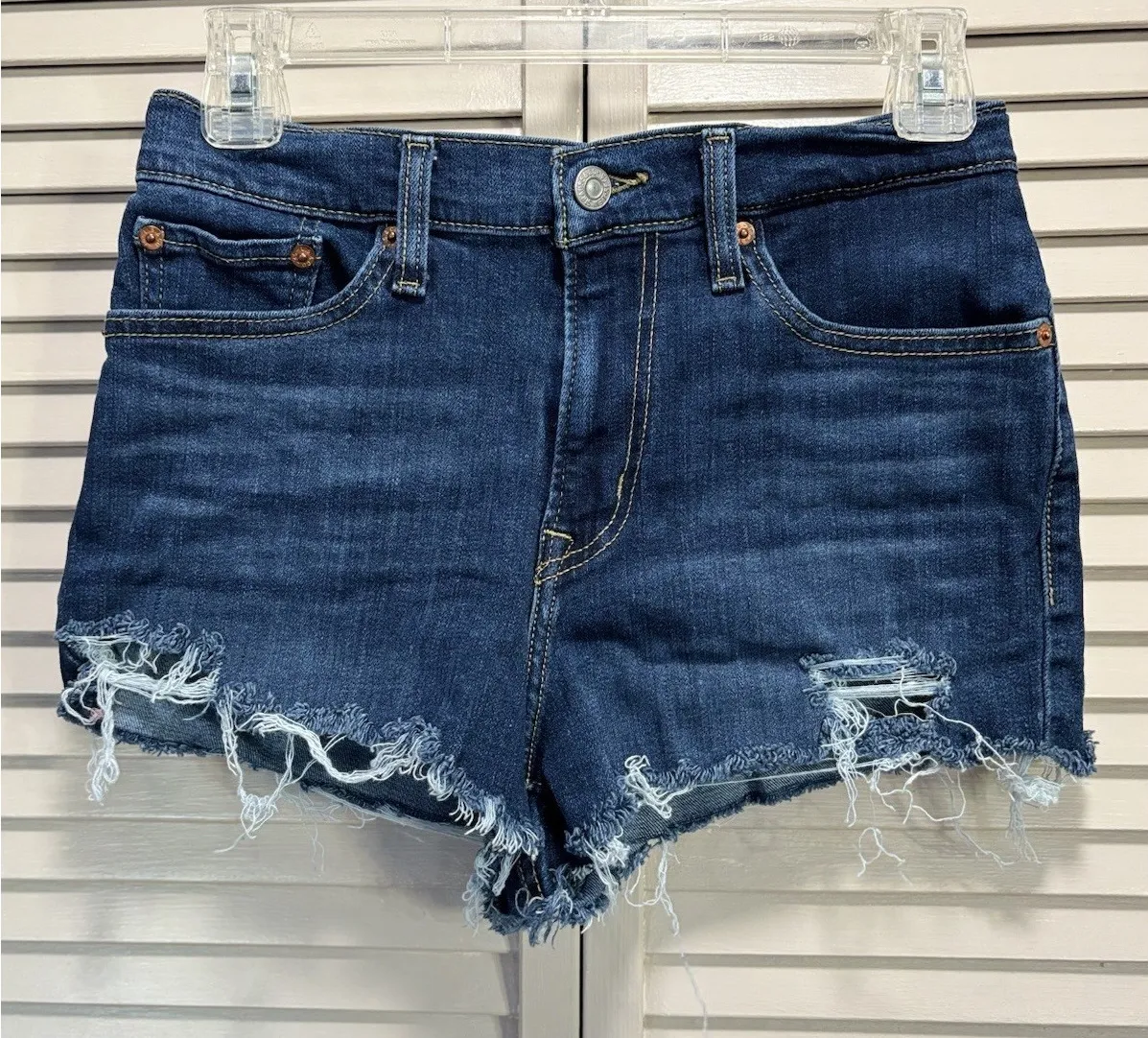 Elevate your summer wardrobe with these stylish Levi's denim jean shorts. The medium wash and cut-of... Show more