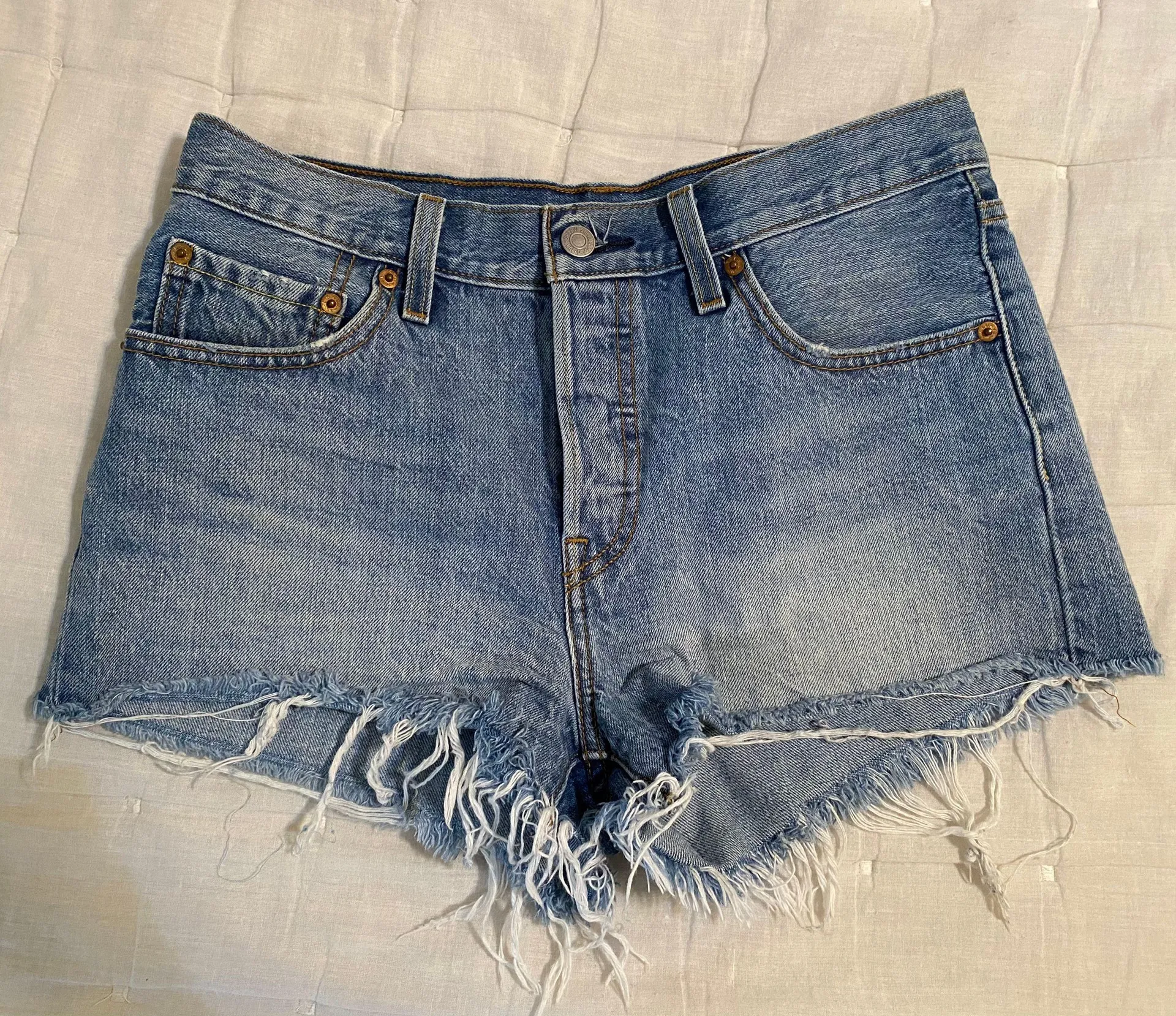 Lightly worn denim shorts. Four button closure. A little loose in the waist but covered behind well.... Show more