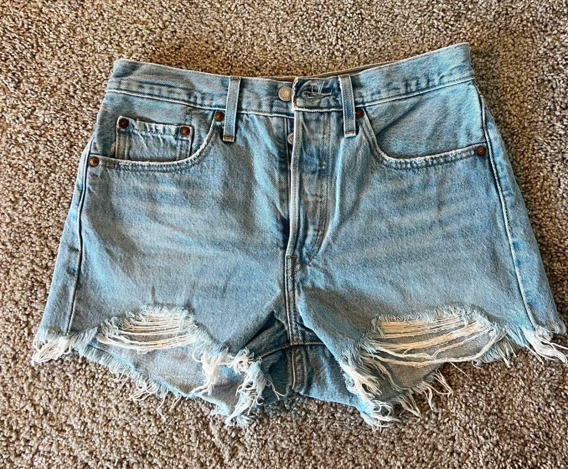 Levi’s 501 distressed denim shorts with button closure. Like new! Worn once on vacation but to big... Show more