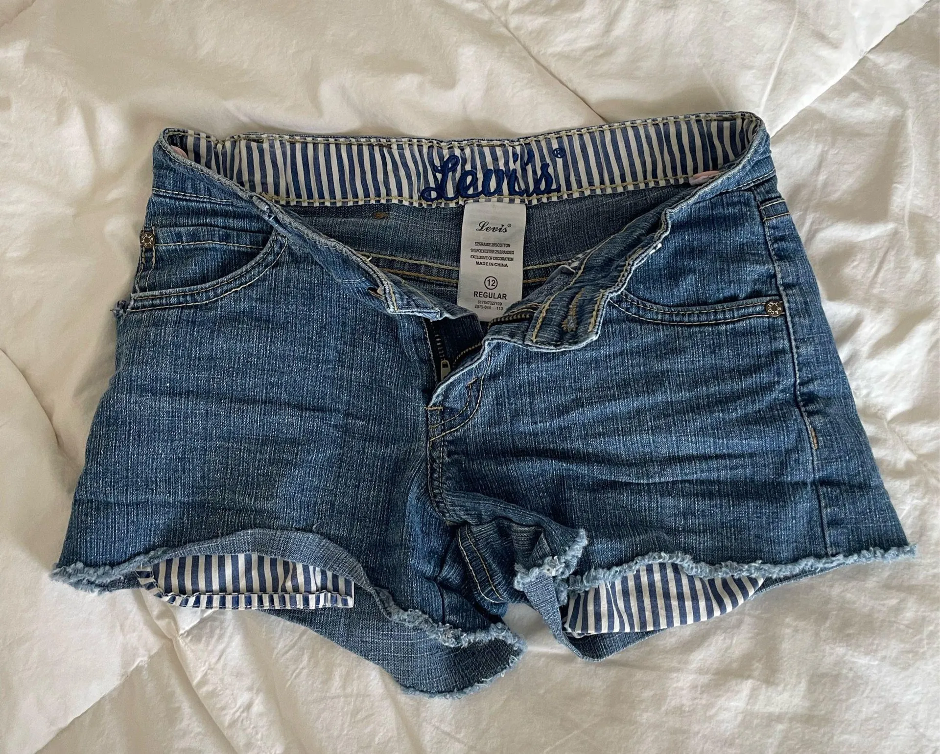 Cute Levi’s blue pinstriped shorts w pattern on front pockets, waistband, and back pocket Size girl... Show more