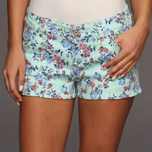 Turquoise Floral Denim Low Rise Zip Fly Button Closure 15" waist 7" rise 17" hips 2" inseam 52% r... Show more