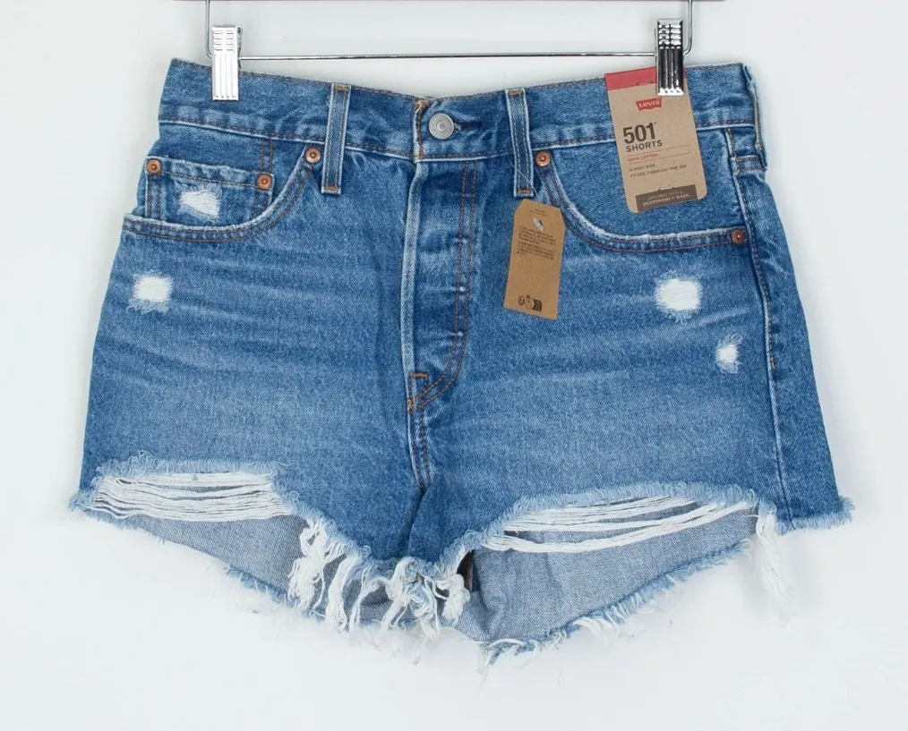 NWT Levis Womens 501 High Rise Button Fly Demin Shorts Size 27 Blue Raw Hem Approximately 13.5" wai... Show more
