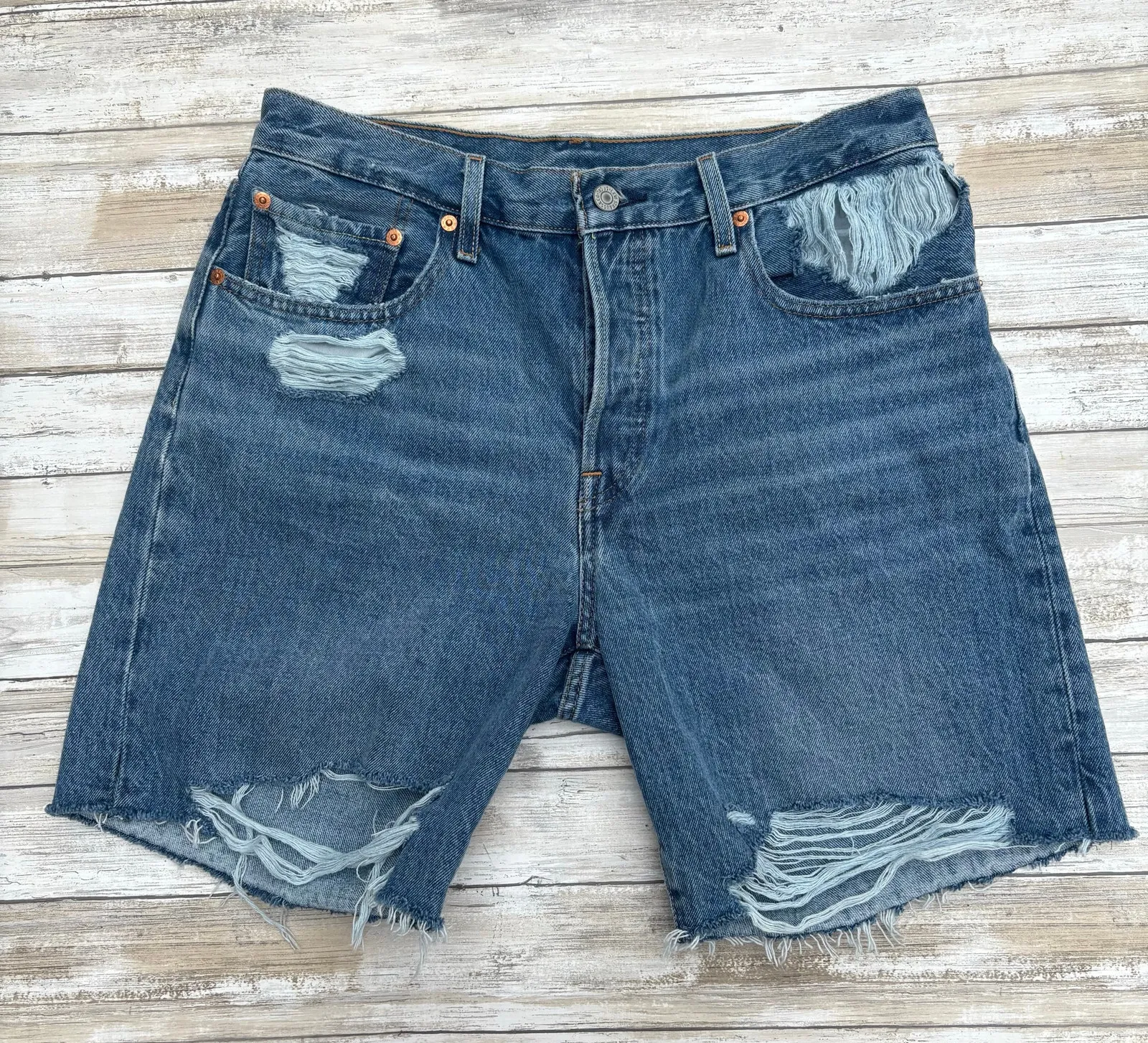 Brand: Levi’s Premium 501 90s Size: 30 - actual measurements below. Waist is more like a 32” Material: 100% cotton Color: Medium wash blue denim with heavy distressing and fading Style: grunge, western, casual, normcore Fit: High Rise, button fly, 5 pockets, cutoff with destroyed hemline Measurements are approx. and taken lying flat. Waist 16” Front Rise 11” Inseam 8” Leg opening 10.5” Ships from a smoke free, pet friendly home. Steam cleaned prior to listing. Condition notes: good preloved condition. Distressed by design. Photographed in natural light. Color may vary under different lighting conditions. Please see images for exact condition, Happy to send more details if requested! Offers welcome.