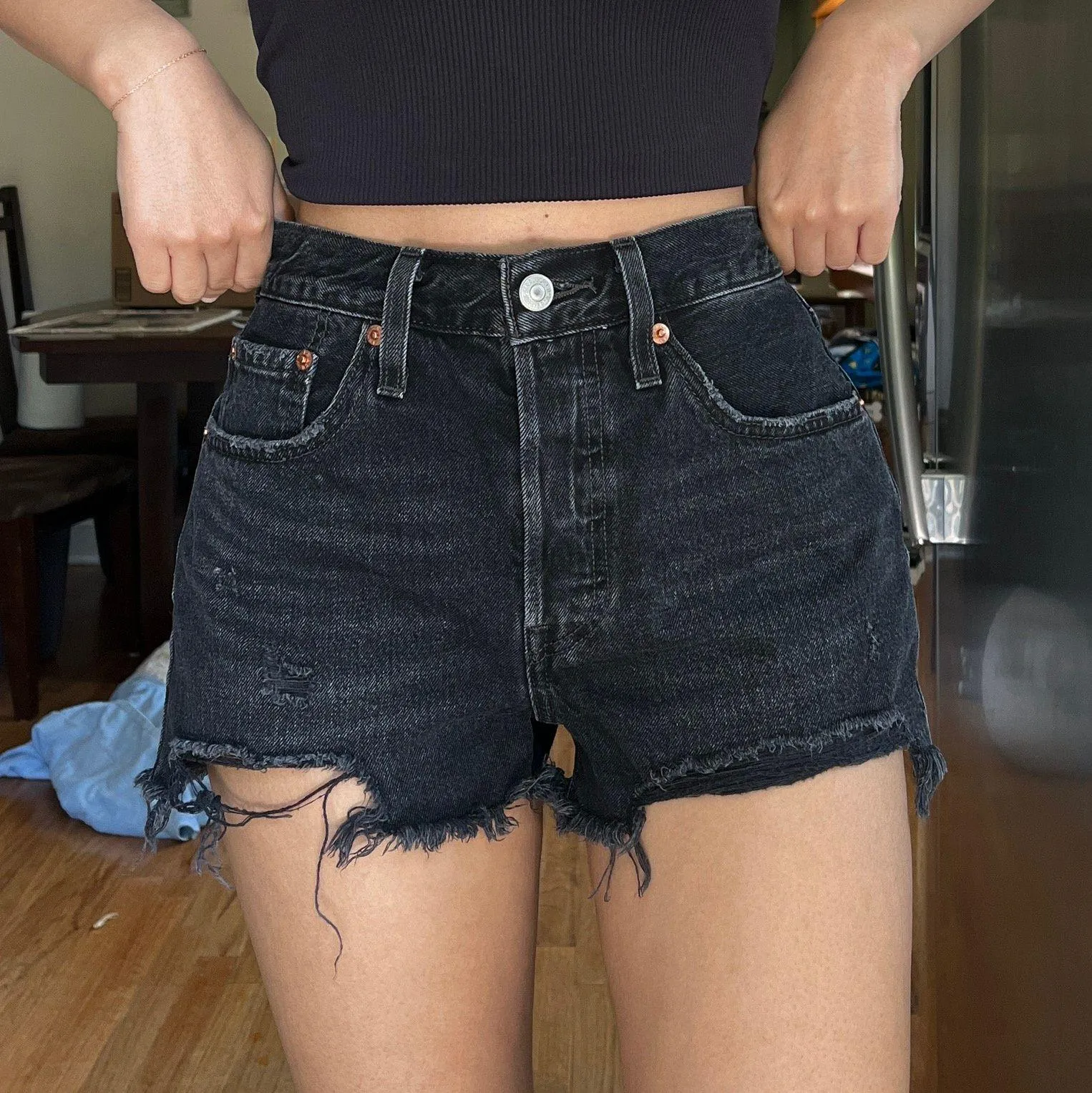 Levi’s premium black distressed 501s. Good condition. Washed black color. *they’re big on me so I’... Show more