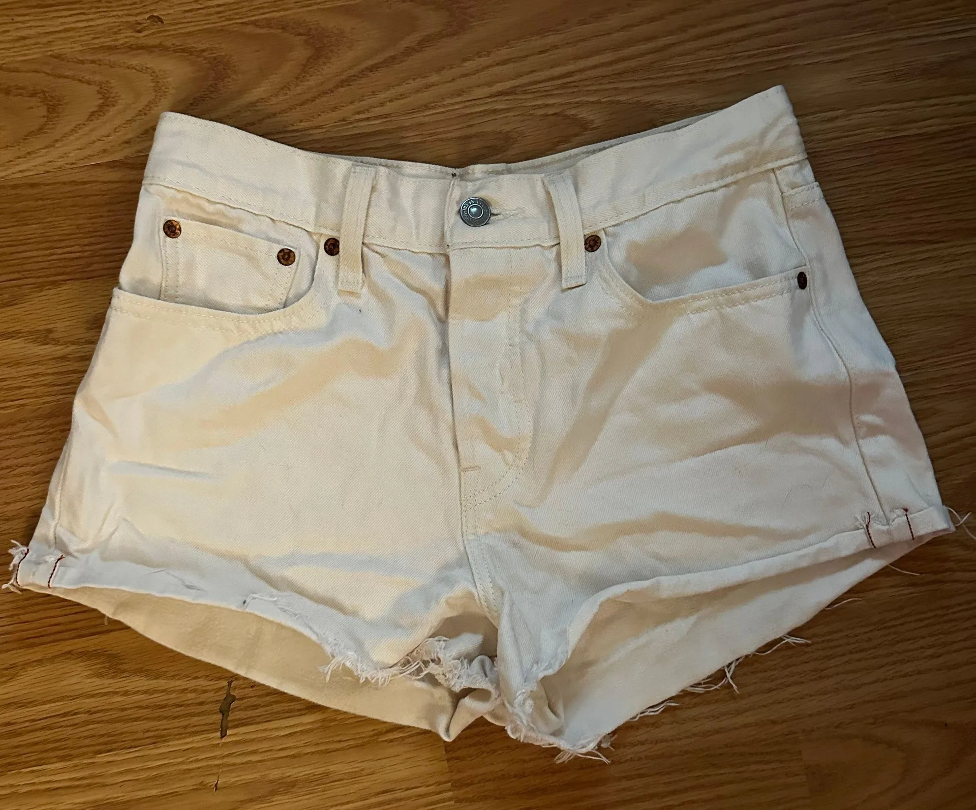 Levi’s shorts, a bit of a creamier white color and they have 4 buttons and no zipper. They say size... Show more