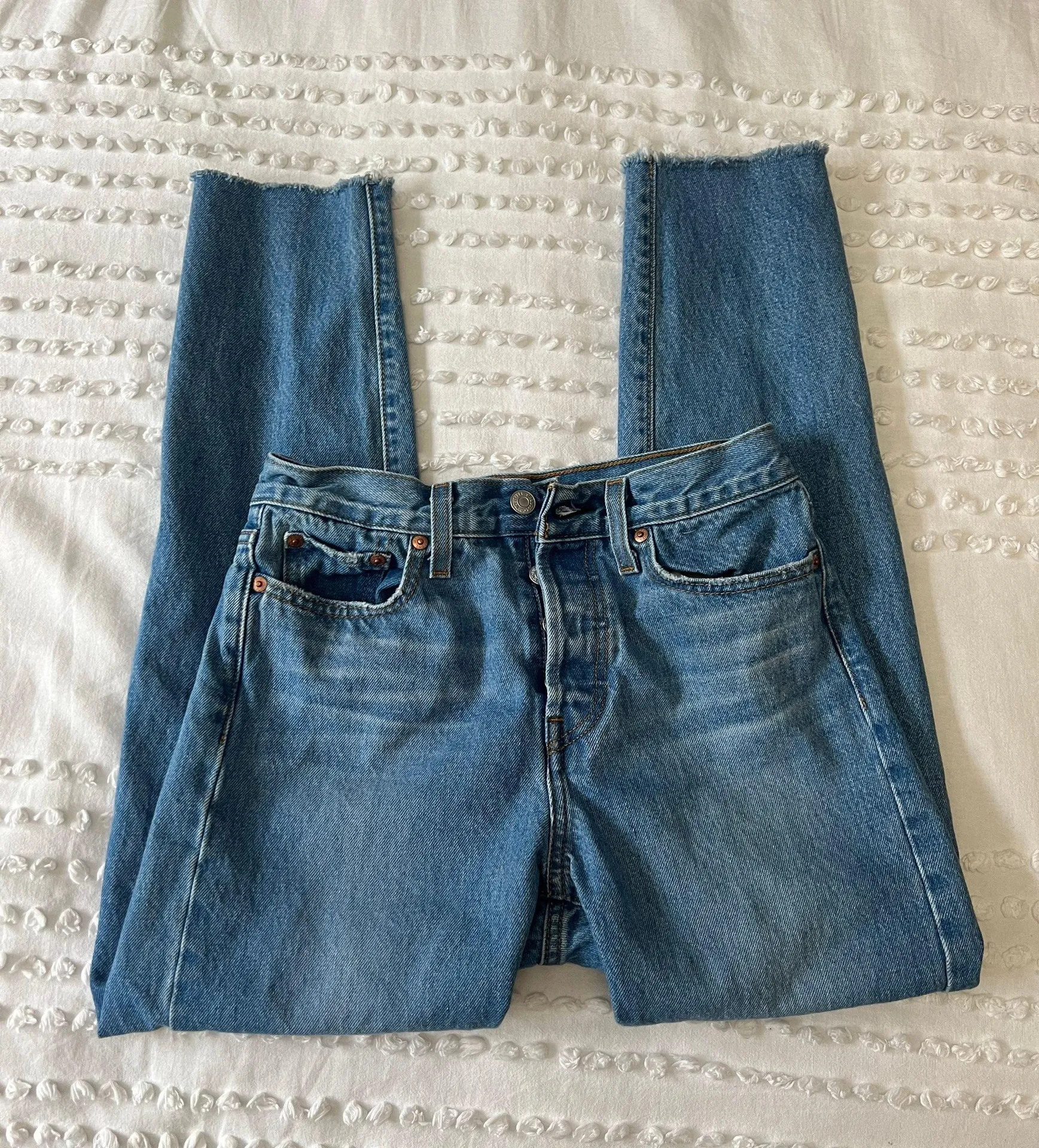 Levi’s medium/ light wash jeans. Frayed on bottoms. Bought them here, tried on but didn’t fit me in... Show more