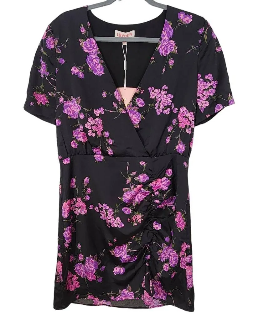 Leyden purple and black mini dress. Make me an offer! Neckline: V-neckline, wrap look Sleeve length: Short puffy sleeves Size: Medium Length: Mini Color: Black and purple floral Special features: Statement sleeves, skirt ruching Closure: Side zipper Condition: New with tags Measurements are approximate and taken while laying flat. Bust: 18.5" pit to pit in back Waist 15" at elastic Length 35" 0424-75-B8c