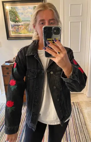 Dark grey jean jacket with rose embroidered back is all plain grey the roses are only on the sleeves