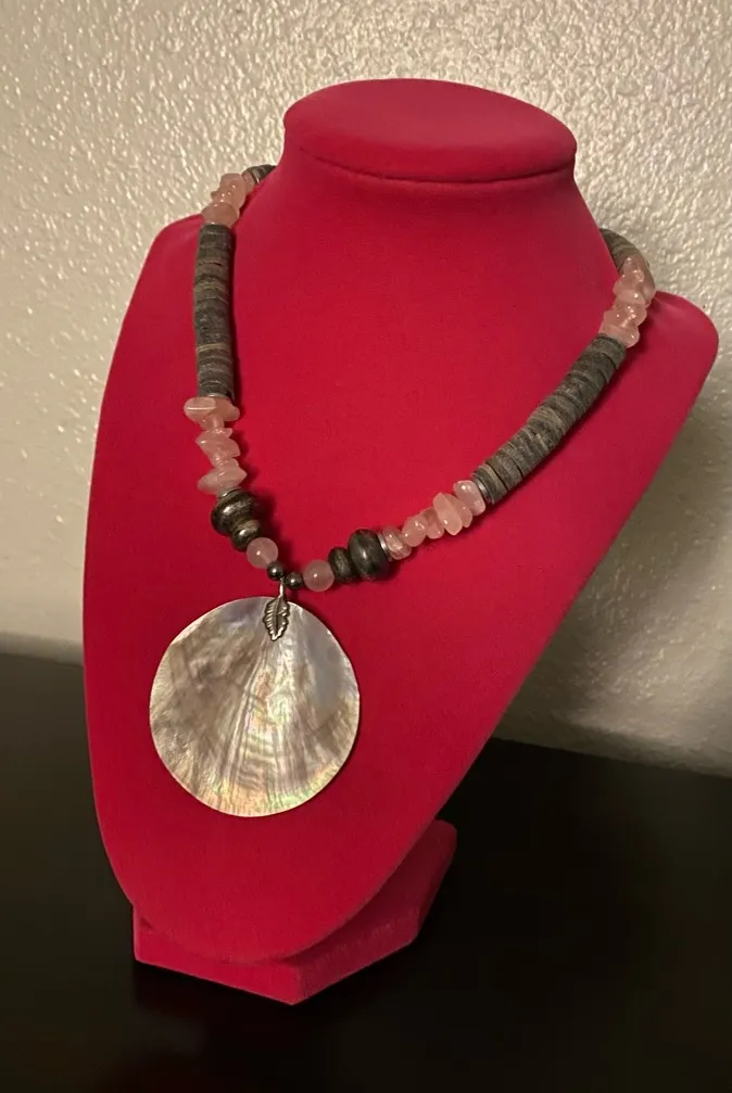 Liberty House Maui tropical pendant necklace featuring a pink rose quartz stone and a large 2” mother-of-pearl (MOP) disc pendant, framed with classic coconut shell and puka bead detailing. Beautiful island-inspired statement piece. • Brand: Liberty House • Length: 16” necklace • Pendant: 2” MOP disc • Materials: Rose quartz, mother of pearl, coconut shell, puka beads • Style: Hawaiian, tropical, island, boho • Condition: Like new Smoke-free home. Ships fast.