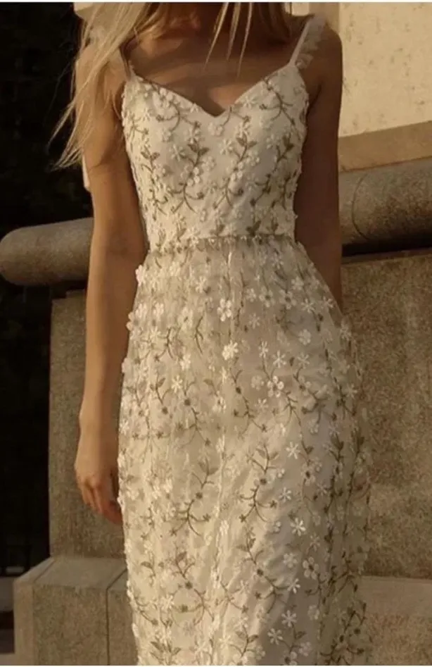 Lichi white embroidered golden floral spaghetti strap midi dress. Like new, worn once. Size small, lined. - $27 - From Clare