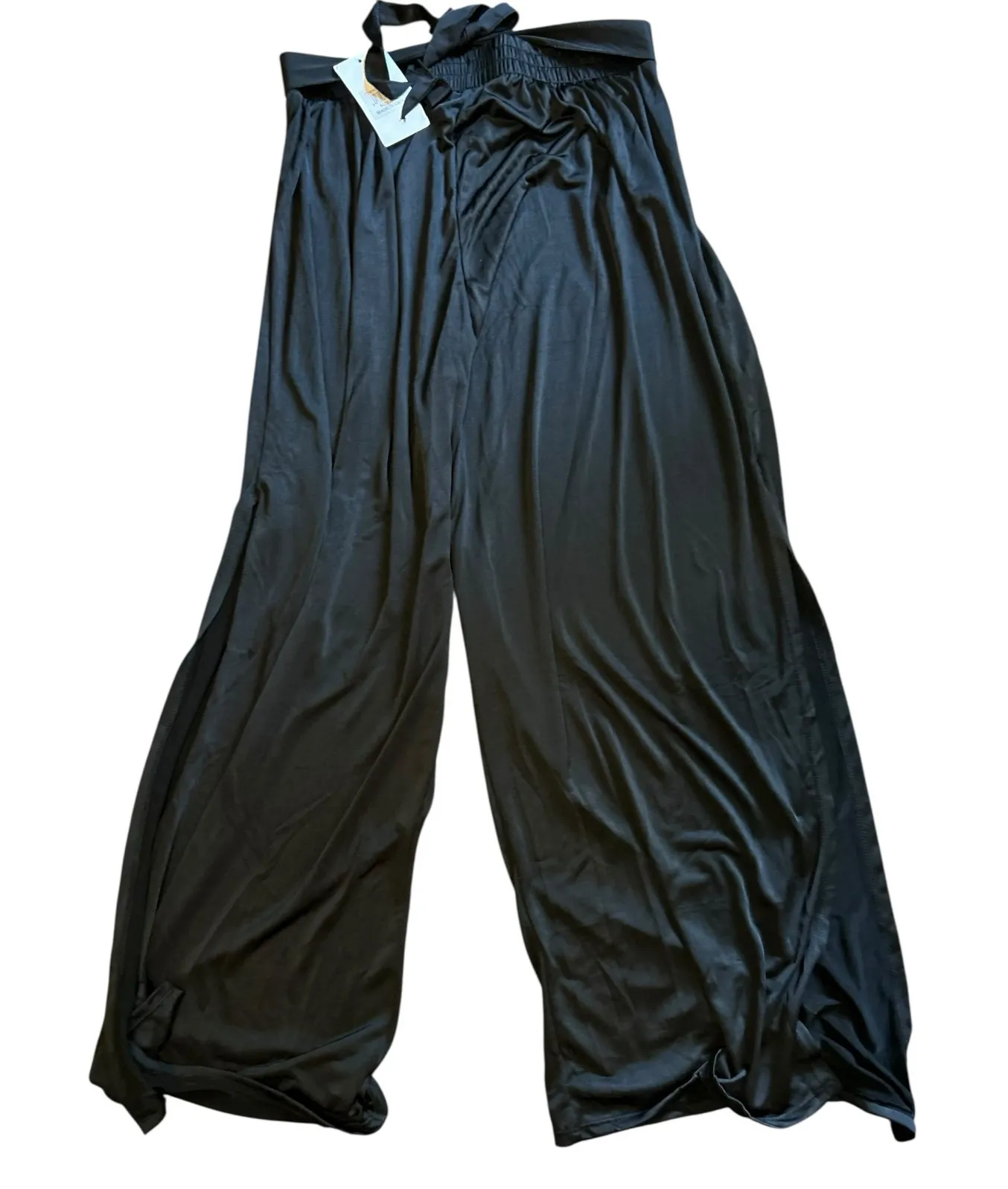 Elevate your wardrobe with the Lida Collection's wide-leg pants. Crafted in a luxurious blend of polyester and spandex, these pants offer a comfortable stretch fit with a high-rise waist and a relaxed silhouette. Whether paired with a crisp blouse for a professional look or dressed down with a casual tee for a coastal vibe, these dress pants are perfect for various occasions, from weddings to travel, and everything in between. Side splits on both wide legs that reach above the knee Elastic back waist with front tie. The pants are smooth, silky, flowing and lightweight Pleated front Deep Black in color Waist 30" Inseam 32" Whimsey Goth Punk Upscale Casual Office Chic Excellent condition for used item, no rips, tears or stains. see pics