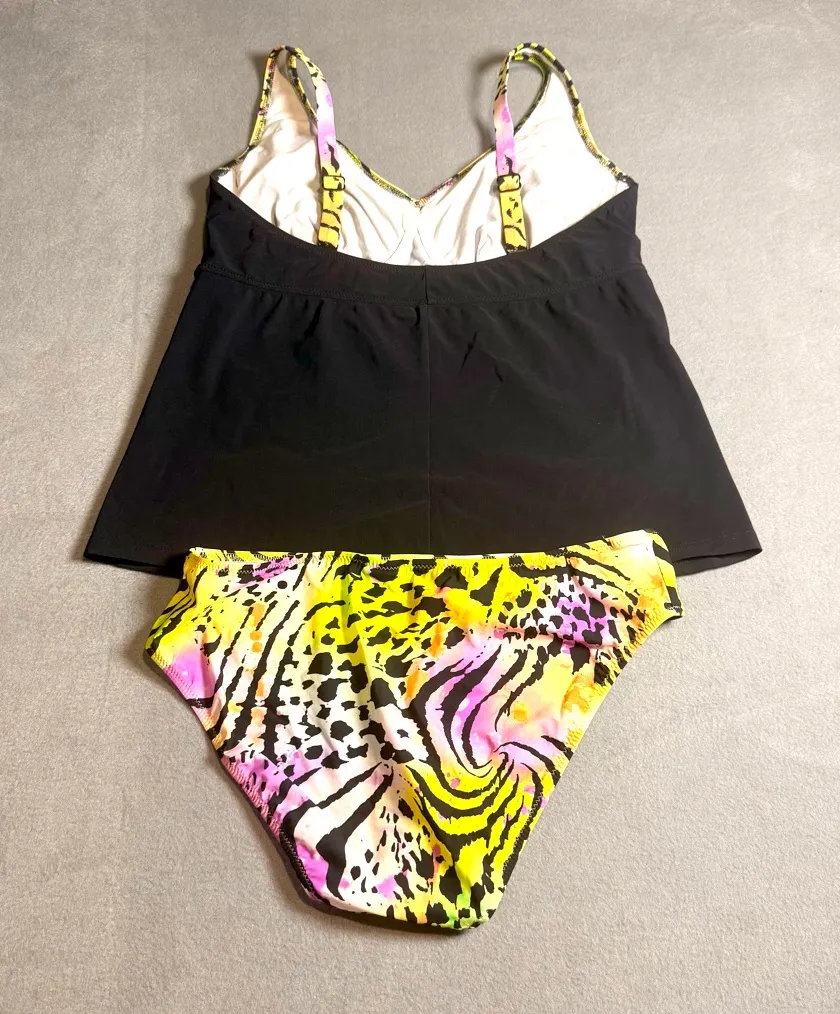 Condition: Excellent pre-owned condition — no flaws Key Features: • Cup Size: C (lightly lined, supportive) • Stretchy, quick-dry swim fabric • Vibrant neon animal print bottom + strap accents • Comfortable fit with supportive bust structure Measurements (approx.): • Top length: 20” shoulder to hem • Bottoms waist: 14” across flat (28” around, stretches to 34”) • Rise: 10” Fabric: 72% Polyamide, 28% Elastane
