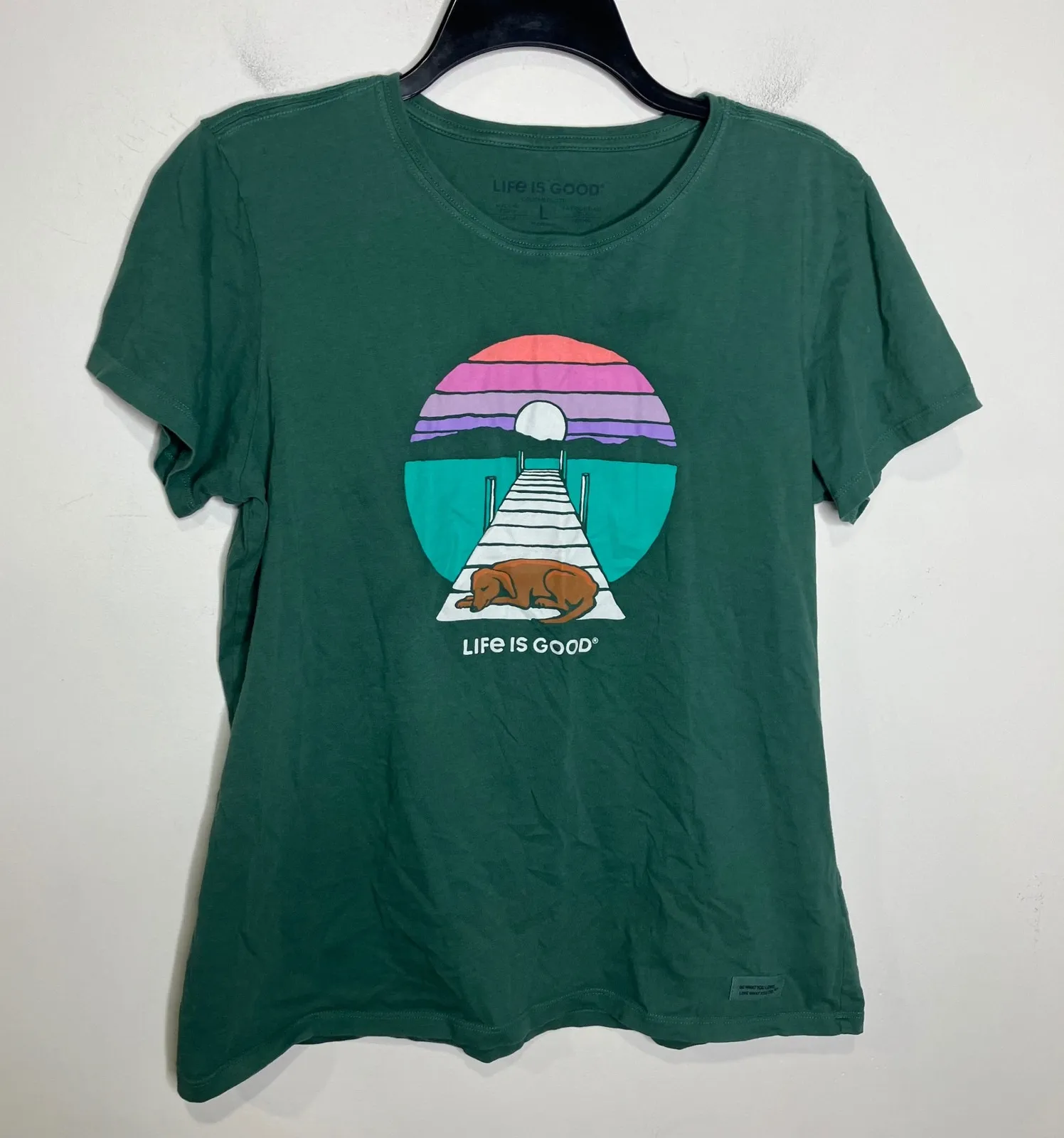 Life is good crusher lite tee, short sleeve green with dog on boardwalk 100% cotton women's size... Show more