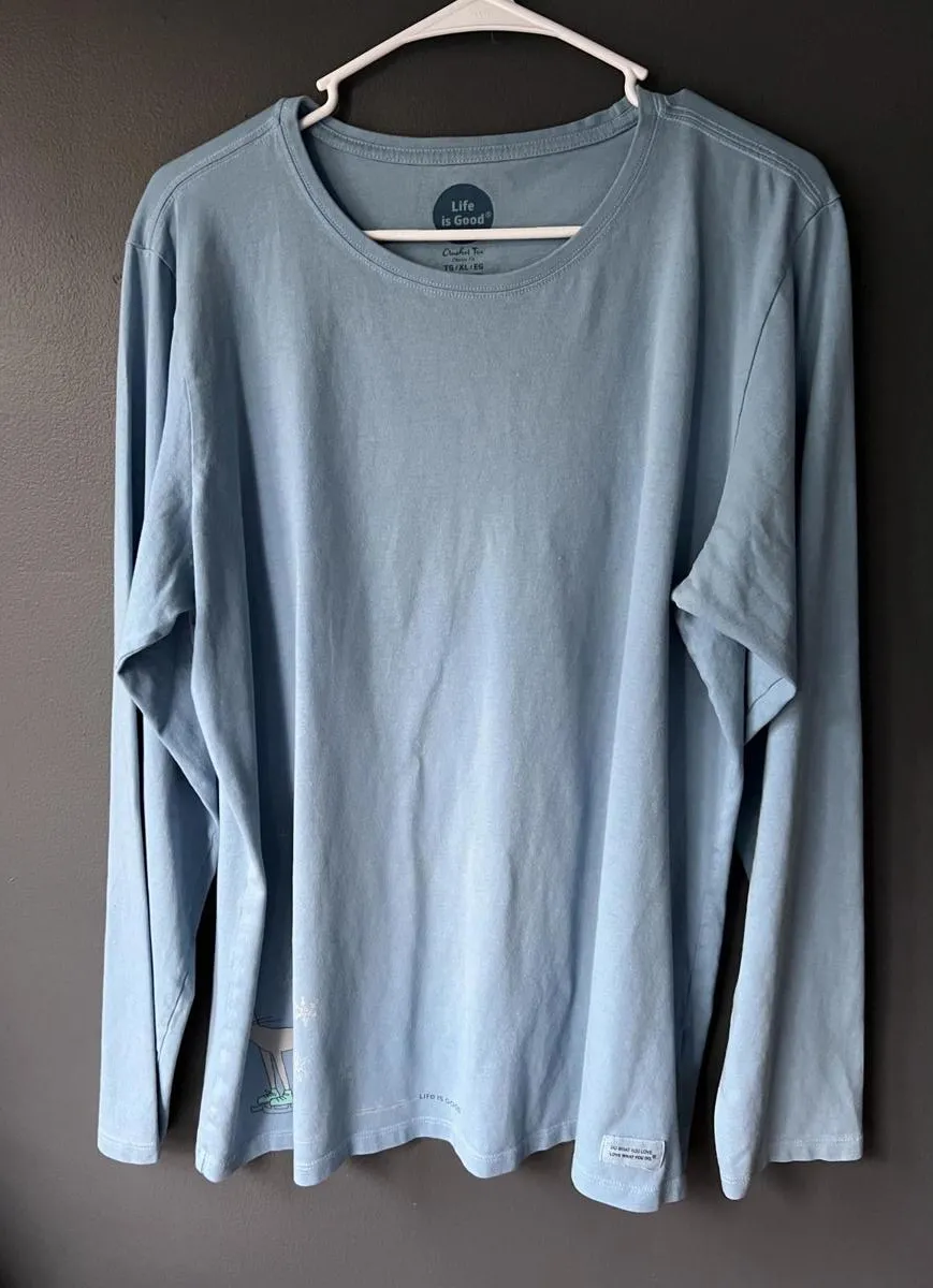 Life is Goid long sleeve t-shirt / sleep shirt in light blue color. Features a playful graphic of a... Show more