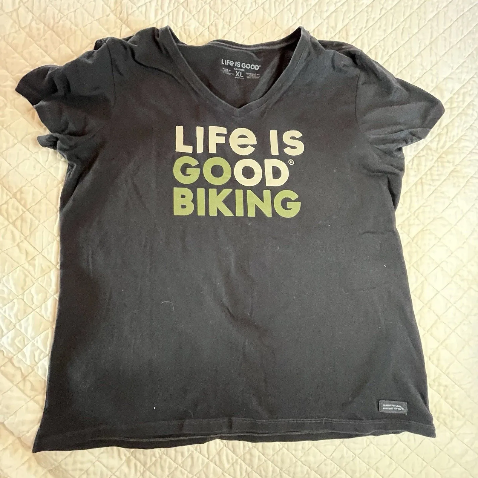 This Life Is Good T Shirt for women in XL size is a black, colorful Crusher T biking top with a V-ne... Show more