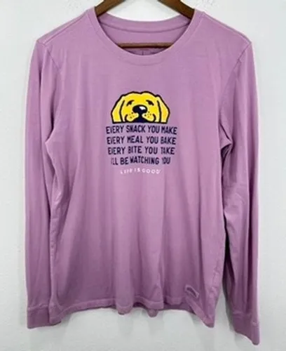 Keywords: Life is Good, Crusher Tee, Long Sleeve, Dog Graphic, Womens Top, Purple Shirt, Casual Wear, Crew Neck, Relaxed Fit, Every Snack You Make, Dog Lover Gift, Cotton Top, Womens Fashion