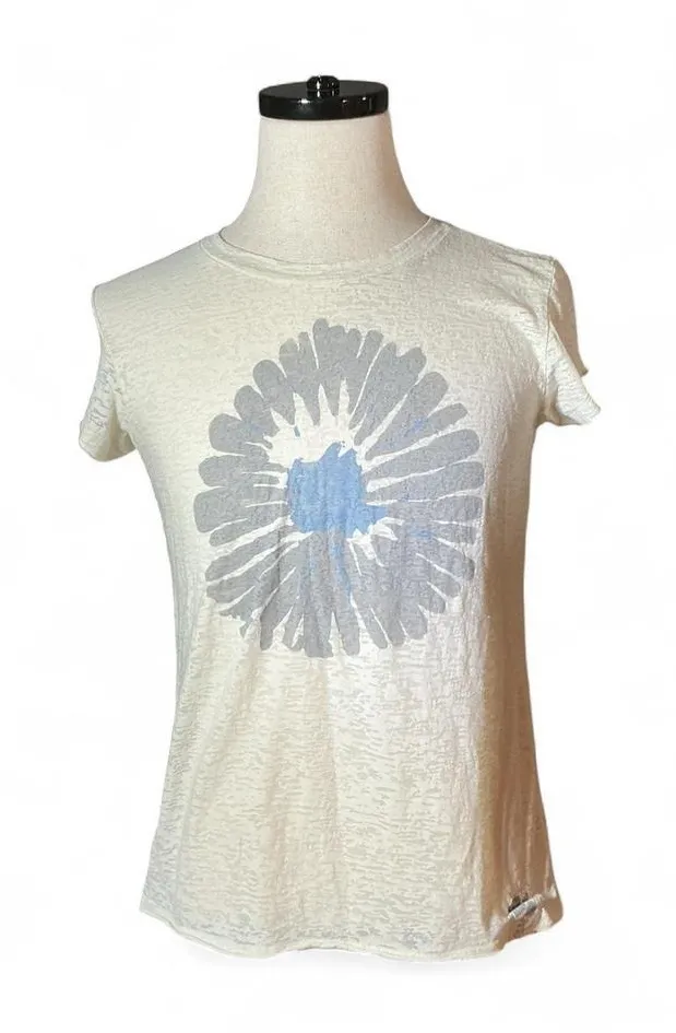 A women's fitted t-shirt by Life is Good in cream featuring a large gray and blue daisy graphic on t... Show more