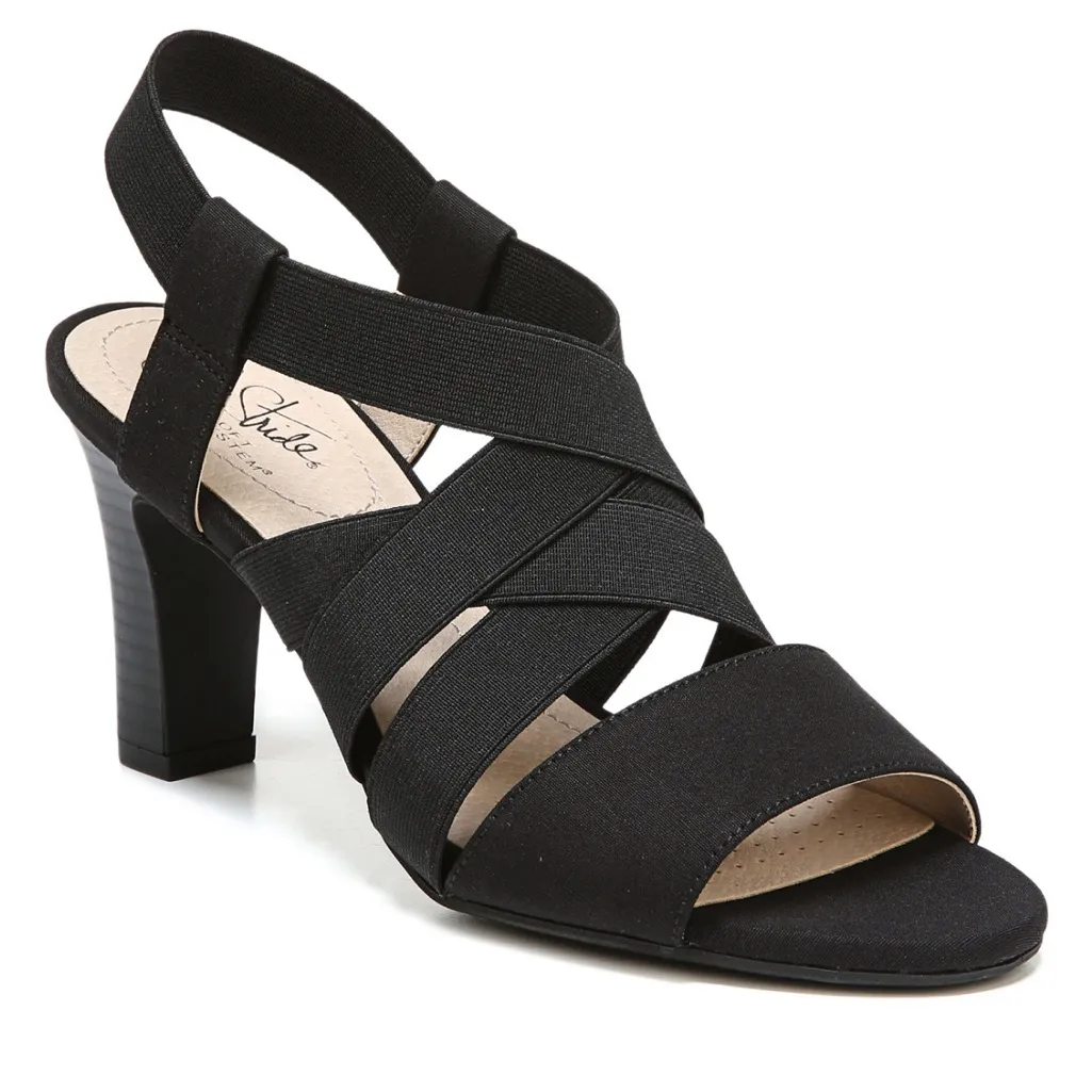 Put your best foot forward in this stylish and sophisticated dress sandal. Fabric upper with an open toe, heel sling strap, and crisscrossing stretch gore straps for extra flexibility. Soft System® comfort package provides all-day support, flex, and cushioning. Traction sole provides you with extra stability. Just Right Height 3-inch heel. Features 3" heel Slip on Fabric upper, Synthetic lining, Synthetic sole Spot clean