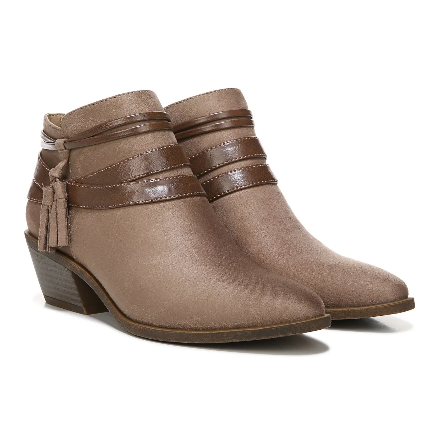 Step into chic comfort with these LifeStride Paloma ankle boots. The soft tan suede upper is beautifully adorned with delicate faux leather straps and charming tassels, adding a touch of Western-inspired flair to your look. A convenient side zipper ensures an easy on and off, while the low block heel provides comfortable lift and stability for all-day wear. Perfect for a casual day out, a weekend brunch, or a cozy evening gathering. Style: Bootie Department: Women Upper Material: Suede UK Shoe Size: 6.5 AU Shoe Size: 10.5 Shoe Shaft Style: Ankle Theme: Bohemian, Cowgirl Lining Material: Fabric Insole Material: Fabric Outsole Material: Rubber Heel Style: Block Heel Height: Low (1-1.9 in) Occasion: Casual, Workwear Toe Shape: Almond Toe Keywords: tan suede boots, western ankle boots, booties, side zip boots, block heel boots, casual boots, fall fashion, winter boots, comfort footwear, fashion boots, low heel boots, boho boots
