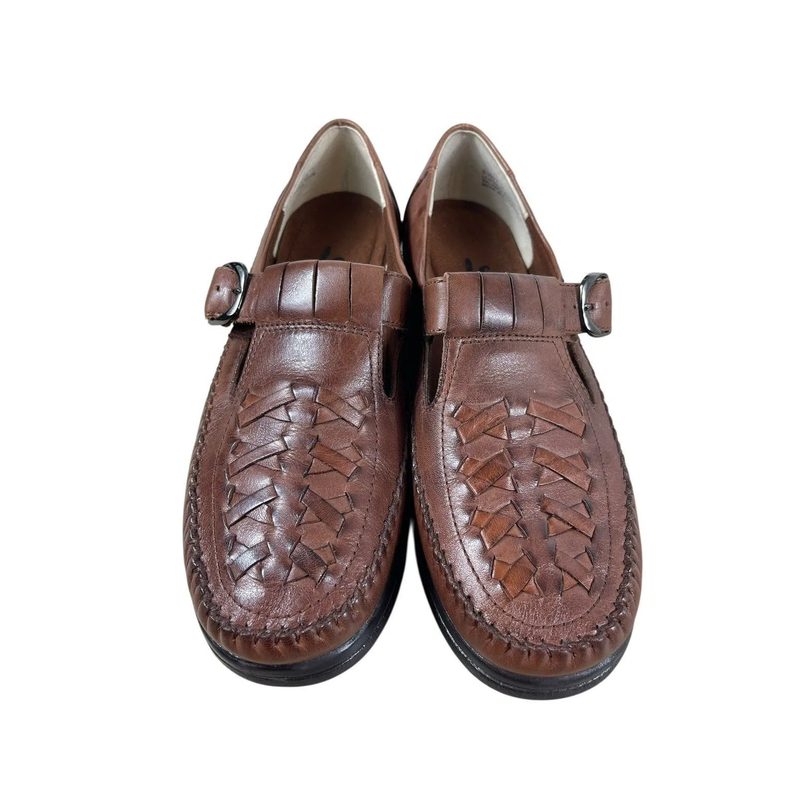 The LifeStride Studio Brown Leather Loafer Shoes for women in size 8.5W are a stylish and comfortable option for everyday wear. These slip-on shoes feature a round toe, low heel, and buckle closure for a secure fit. Made from leather with a woven fabric accent, these shoes are perfect for casual, workwear, or travel occasions during the summer, fall, or spring seasons. The minimalist yet classic style appeals to a coastal grandma or preppy aesthetic, making them a versatile addition to any wardrobe. Looks unworn.