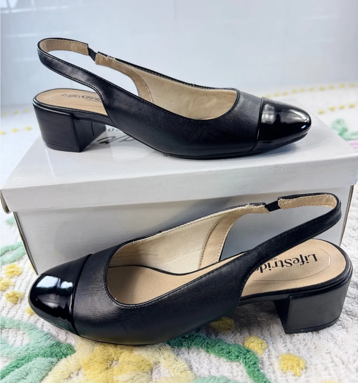 Step into sophisticated comfort with these LifeStride slingback heels. The sleek black leather is beautifully accented with a glossy cap toe, adding a touch of polished charm to your look. Designed with your comfort in mind, the slingback strap ensures a secure and elegant fit, while the block heel provides stable elevation. Perfect for transitioning from a busy workday to an evening out, these shoes are ideal for the office, a dinner date, or a special occasion. Measurements: • Heel Height: 2 in Style: Slingback Department: Women Upper Material: Leather, Patent Leather Heel Style: Block Type: Heel Toe Shape: Closed Toe Pattern: Solid Heel Height: Mid (2-2.9 in) Closure: Pull On Features: Cap Toe, Adjustable Strap, Cushioned Insole Material: Synthetic Outsole Material: Rubber Lining Material: Synthetic Keywords: womens shoes, black heels, cap toe, slingback heels, block heel, dress shoes, work shoes, comfortable heels, classic style, evening shoes, office attire, elegant footwear
