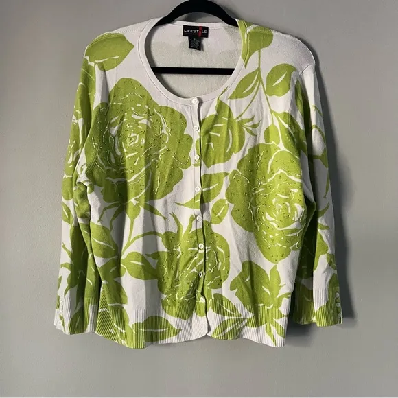 Lifestyle button up cardigan white with green floral print, beaded front size xl - $20 - From Kristine