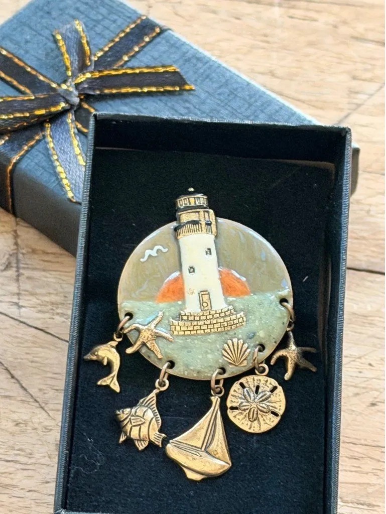 This brooch features a detailed enamel lighthouse design with gold-tone nautical charms, including a sailboat and seashells, offering a coastal-inspired accessory. • Gold-tone charms include sailboat, sand dollar, fish, and starfish • Measures approximately 2.5 inches in length • Comes with a black display box • Secure pin-back closure Measures approximately 2.5 inches top to bottom. No visible flaws, excellent condition.