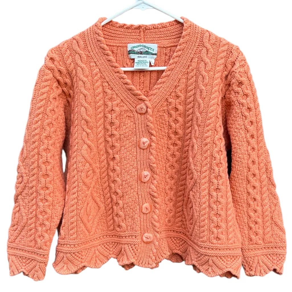 Worn once; Gorgeous shade of muted orange 100% merino wool; button front; darling scalloped hem and cuffs; multi pattern cables; pit to pit measures approx. “ across and stretches; shoulder to hem measures approx. “ (slightly cropped length); smoke free home. c