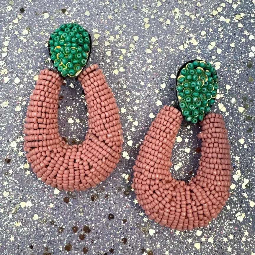 Chic oversized earrings with pink and green beads. Perfect for stylish looks. Tags: Beach, Boho, Wi... Show more