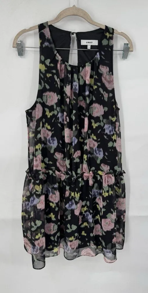 Great pre owned condition. Keyhole back. Mini length. Had inner lining. Size 8. All measurements are approximate: 18 inches pit to pit. 42 inch waist. 36 inch length from shoulder to bottom hem.